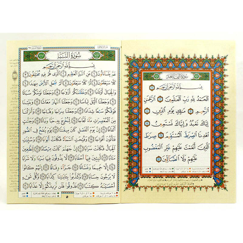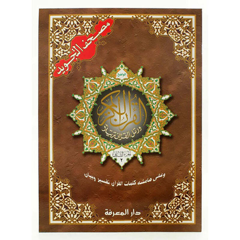 This is the extra large size Luxury paperback Tajweed Quran divided into thirty separate parts, it all comes in a nice black and solid leather bag which is perfectly designed to keep the parts from any loss or damage, its features distinct colors for each Tajweed rule, making it easier to follow and correct recitation of your Tajweed of the Qur'an. This Tajweed Quran makes it much easier for a group of people to read the whole Quran in the very same time, by spreading the parts among them. It is also an ideal for passengers so they only carry one lightweight part at a time, avoiding the heavy weight of the normal Quran, so you can take one or two parts which didn't take place in your bag. These thirty parts of Tajweed Quran comes in the standard portrait form, each part comes with a nice glossy softcover, and every part is numbered on the front, from 1 to 30. Each page contains 15 lines as any standard Quran, with an interpretation of selected words placed on the margins on every page. In the mosque size of this product (10"x14") the font size is bigger than the standard scripts making reading much easier especially for elders. Allah (SW) ordered us in his holy book to recite the Quran with Tajweed ... "Quran recitation modulating". The system of Tajweed serves as a guide for improving the recitation of Quranic style. It was in this way that the Qur'an revealed to Prophet Muhammad (peace be upon him), as well as the manner in which he recited it. Therefore, the readers of the Quran are eager to realize the promise of the Prophet Muhammad (PBUH): "whoever recites the Quran correctly and proficiently will be with the bountiful dutiful writers (the angels of the preserved tablet - Al lauh Al Mahfuz". Based on a practical understanding of phonology, we have color-coded some letters to facilitate the correct recitation of the Holy Quran. This enabled us to classify these letters into three possible categories to enhance the reader's knowledge and remembering of Tajweed rules: The letters which require expanded vocalization. We used red color to highlight these letters. The letters which are nasalized these letters are green in color. The dark blue color indicates the emphasis of the letter (R), the blue color indicates the unrest letters-echoing sound- (qualquala) While the letters which are written but are not vocalized. These letters are gray in color. The reader will get used to reciting the Quran by using colors very easily. By engaging the eye, the reader will find him/herself applying 24 rules of Tajweed with ease and precision while his/her mind is left un-enganged to comprehend and understand the meaning of the holy Quran. For more details click here This Tajweed Quran is in Hafs narration. All our Tajweed Quran products -including this Quran- come with the following: Color-coded letters: to present the Tajweed rules, very good and simple way to learn and apply Tajweed rules. Obvious script: extra spaces were added between the words in order to make it easier to read and recite the Quran. Permissible stops: long spaces were added at certain places where it is permissible to stop. It helps to avoid stopping at wrong places or times. A set of very useful indexes such as Surahs Color Index, Subject Index. Tajweed rules explained in details with helpful illustration.