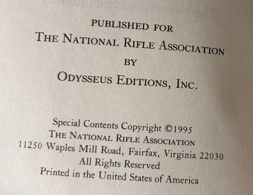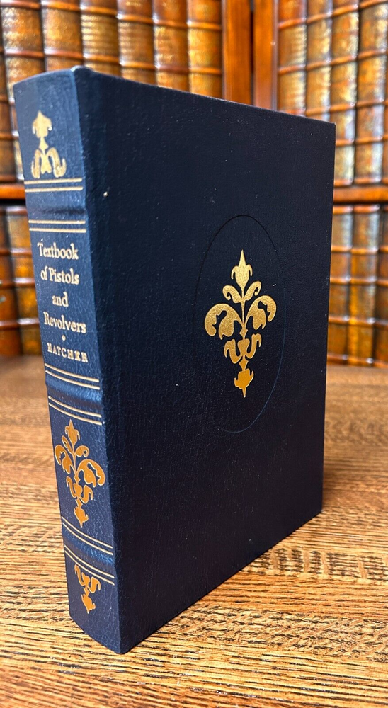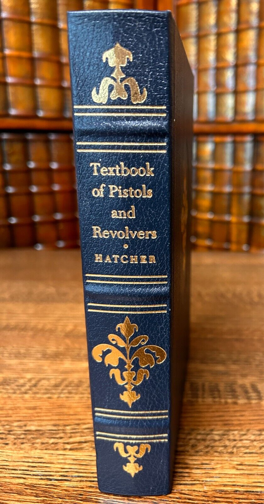 Textbook of Pistols and Revolvers, Julian S Hatcher, NRA 1995 Firearms Leather NRA Special Edition, Leather printed for Members of the NRA Firearms Classics Library, 1995 Odysseus Unmarked. Minor handling and use wear. Note the touch of rubbing to corner tips on view of the gold gilt edge. Full leather, with gold gilt. Raised bands to spine, satin marker.
