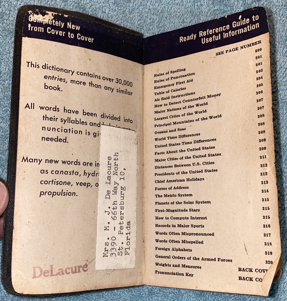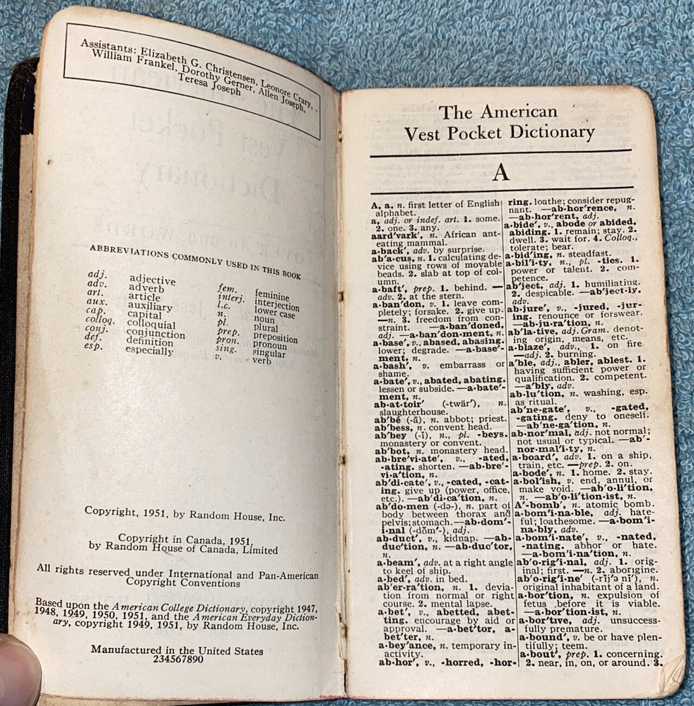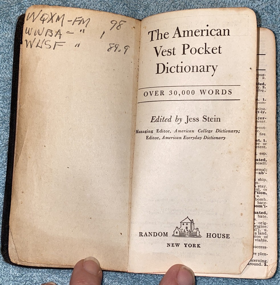 Used. Shows wear from use. Has some writing and a sticker. Please review all the photos prior to making a purchase. The American Vest Pocket Dictionary VINTAGE 1951. 9/22 Our store has a 4 day processing time that does not include weekends. If you need an item delivered by a specific time please message us first to see if delivery is possible. Books are typically shipped in poly mailers or bubble mailers. Boxes are only used if requested and may result in an additional shipping charge. This book is being shipped via media mail. Media Mail is the slowest method offered by the Postal Service. It may take more than a week for delivery. If you need expedited shipping please contact me prior to purchasing the item.