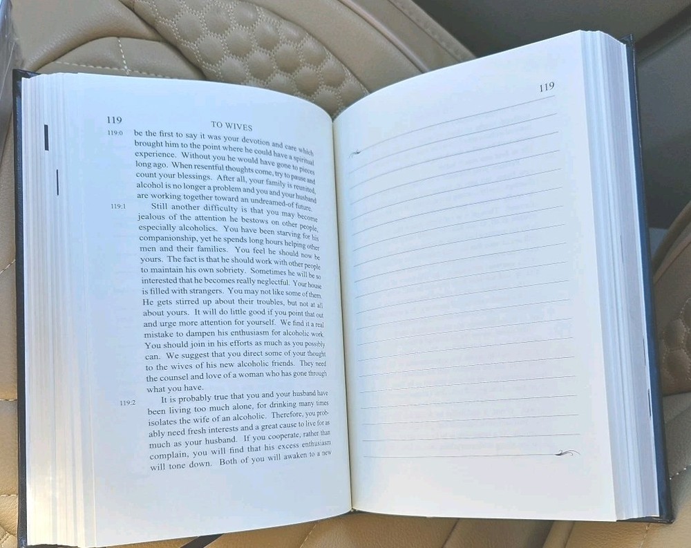 | Synopsis | The text of Alcoholics Anonymous with pages opposite text for notes. Includes a word index, subject index and dictionary. Complete retyped "Original Manuscript" of the text. 2 place keeping ribbons. Black leather cover. |