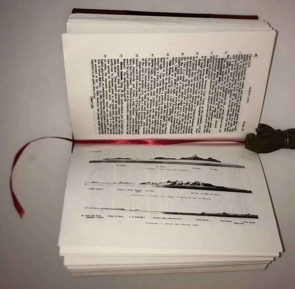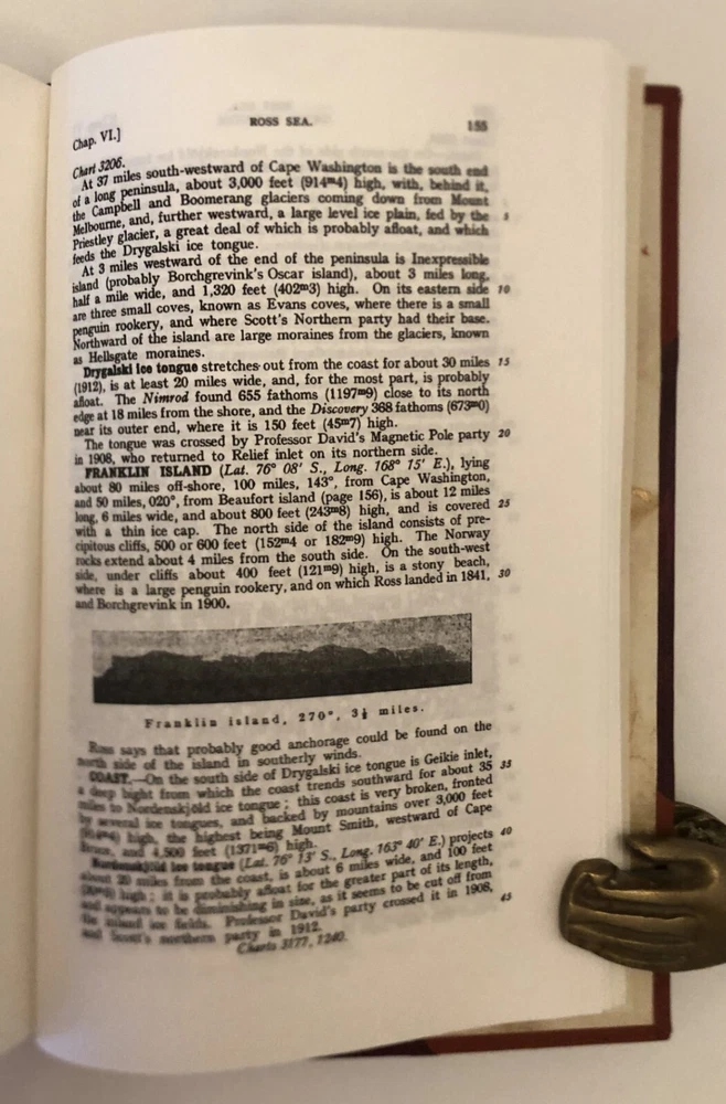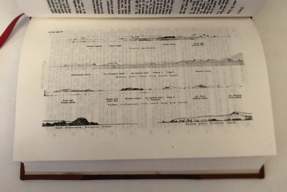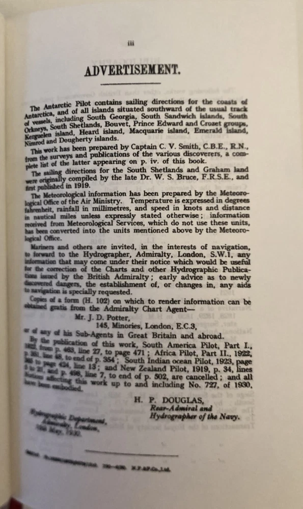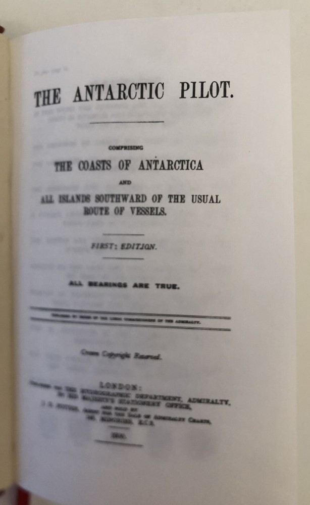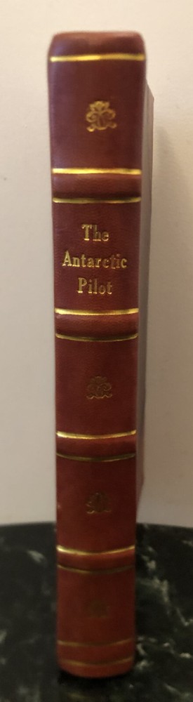 Slight bowing of boards, see photos. Otherwise pristine, brand new, unmarked. No ownership marks. This is a high-quality reprint of "The Antarctic pilot comprising the coasts of Antarctica and all islands southward of the usual route of vessels 1930," edited by the British Admiralty's hydrography department for ships approaching Antarctica. Bound in goat leather, printed in 2018 from the original 1930 edition. 194 pages, with maps and graphics. With red silk bookmark ribbon. A wonderful addition to any polar or adventure library. I am selling it only because I have obtained a first edition at more than 10x the price of this reproduction.