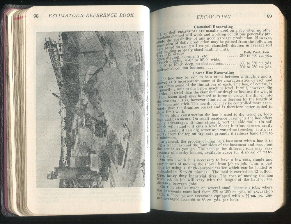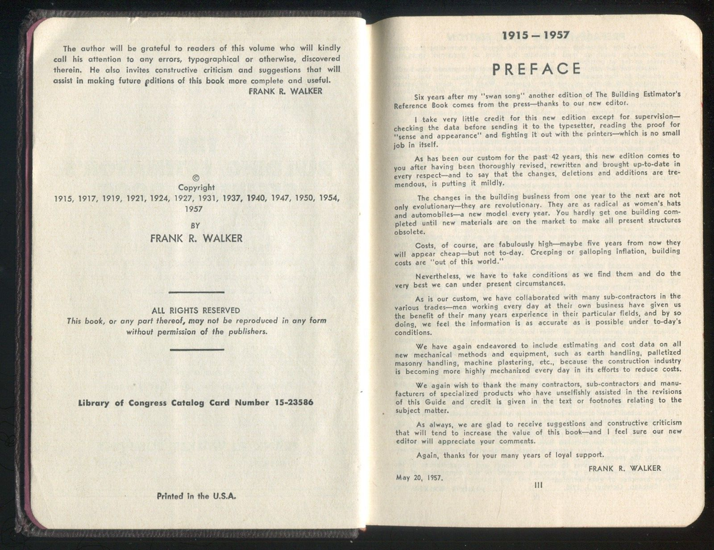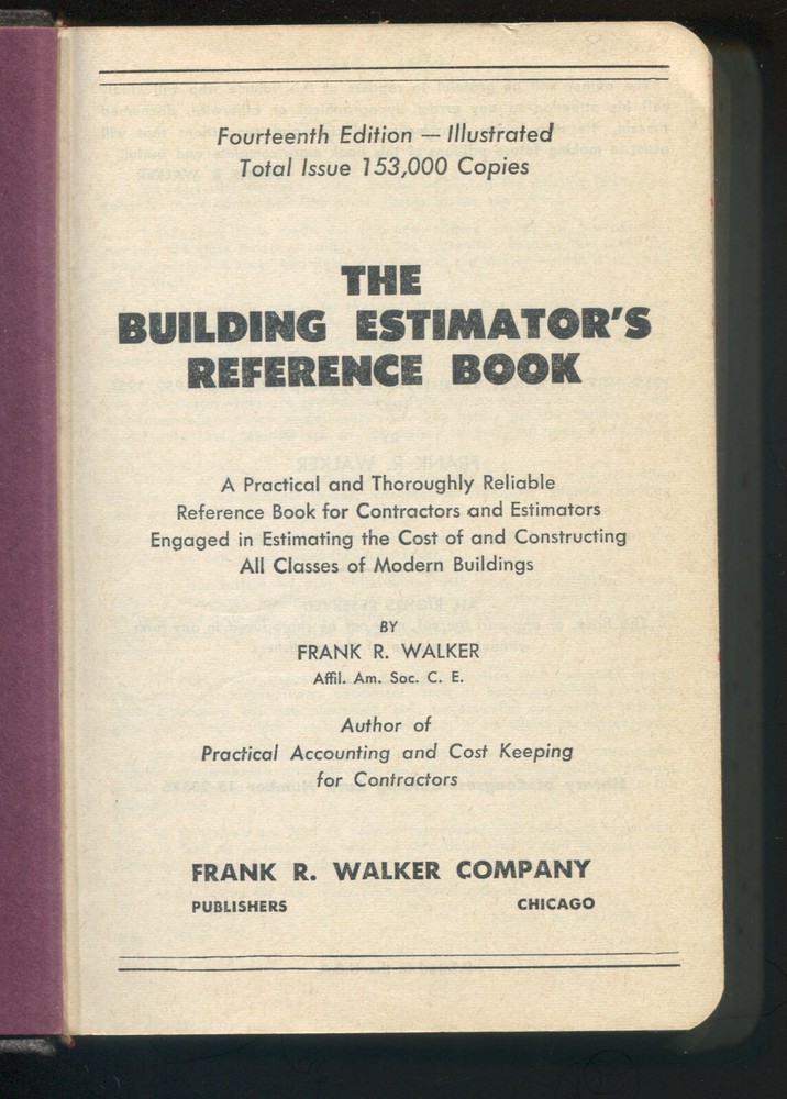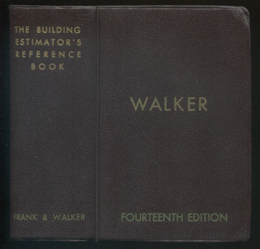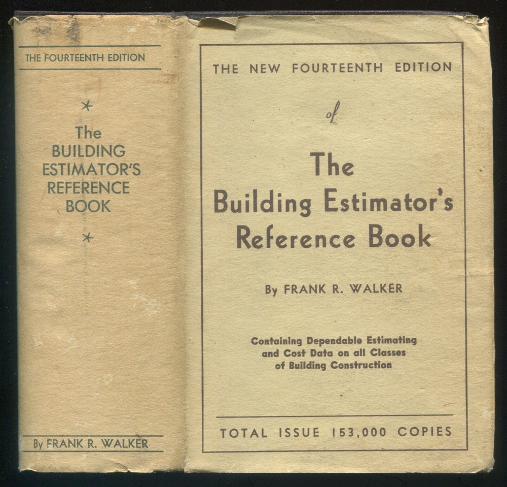 The Building Estimator's Reference Book, by Frank R. Walker, 14th Edition Data: ~ 4.5" x 6.5" x 2.5", 1780pp, maroon leatherette(?), illustrated, indexed Condition: cover shows crush upper front corner, pages clean, binding good, dj shows wear/damage/tears/repair Origin: Frank R. Walker, ©1957 Every item sold is carefully packed for safe shipping. Combined shipping available. International buyers welcome.