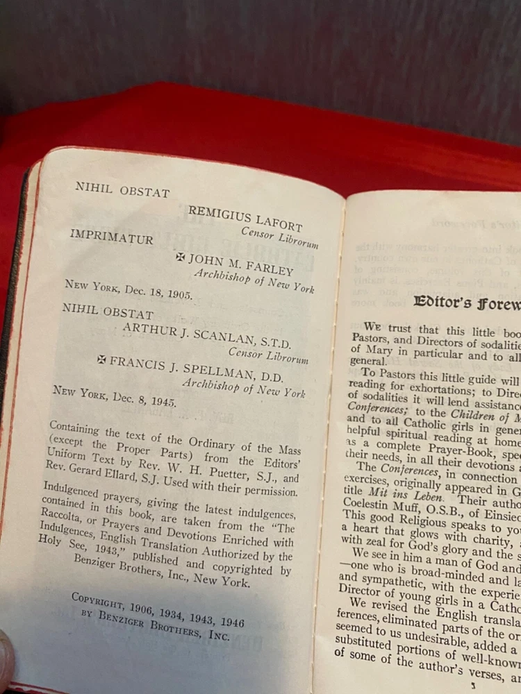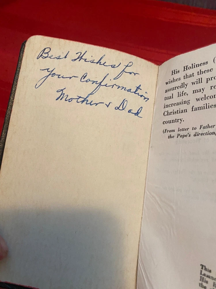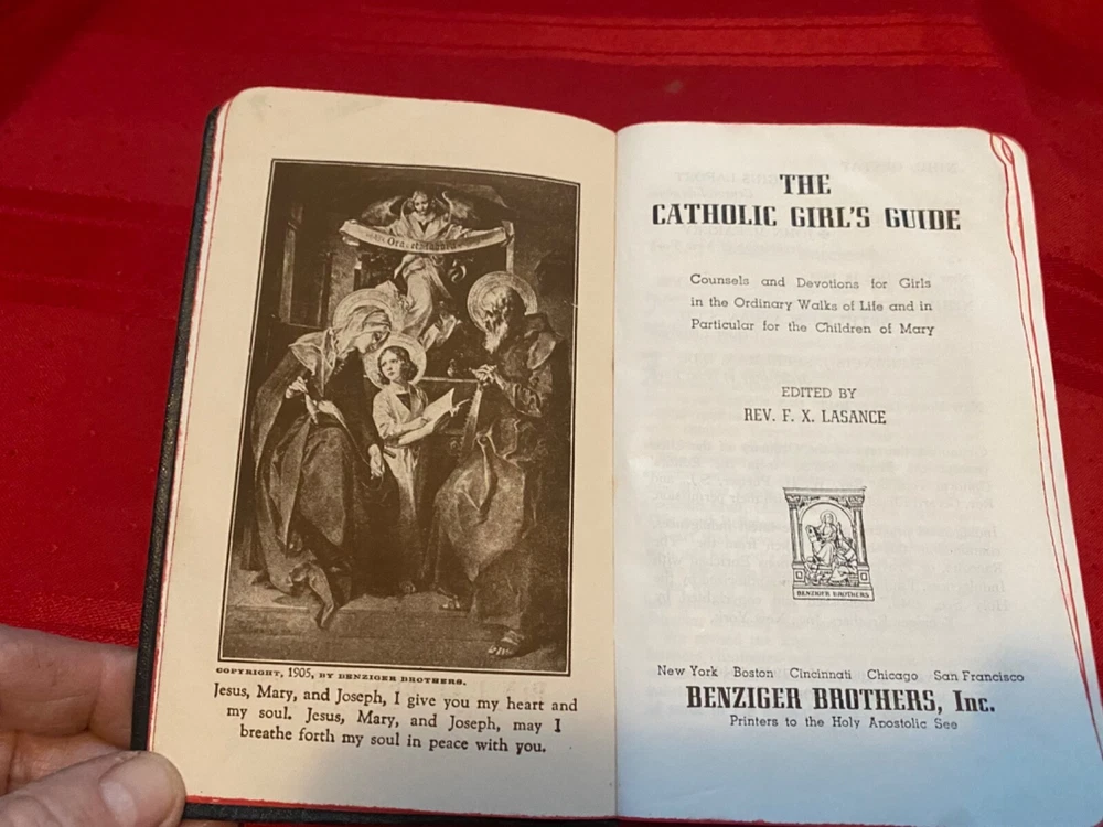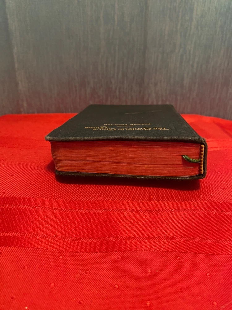 This vintage “the Catholic girls guide“ is councils and devotions for girls in the ordinary walks of life and in particular for the children of Mary it is edited by Reverend F. X. LASANCE. It is dated December 8, 1945. It mother and dad. It also has the owners name and address on the back page. In addition there is a hand written a nurse’s prayer towards the rear of the book. The binding is in beautiful condition there is a mark on the front It is dedicated in the front with best wishes for your confirmation from mother and dad. It also has the owners name and address on the back page. In addition there is a hand written a nurses prayer towards the rear of the book. The binding is in beautiful condition there is a mark on the front cover please see photographs The book itself measures five and three-quarter inches tall it is three and three-quarter inches wide and 1 inch thick