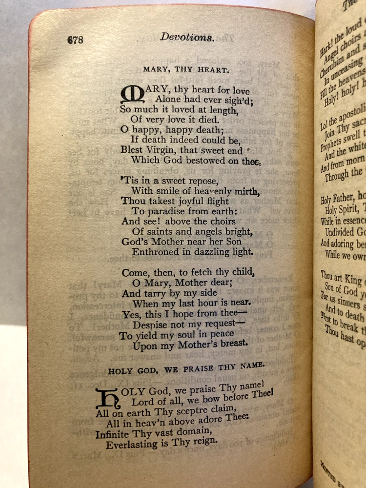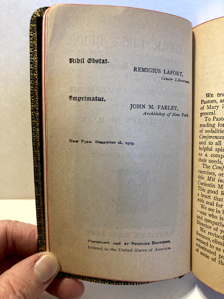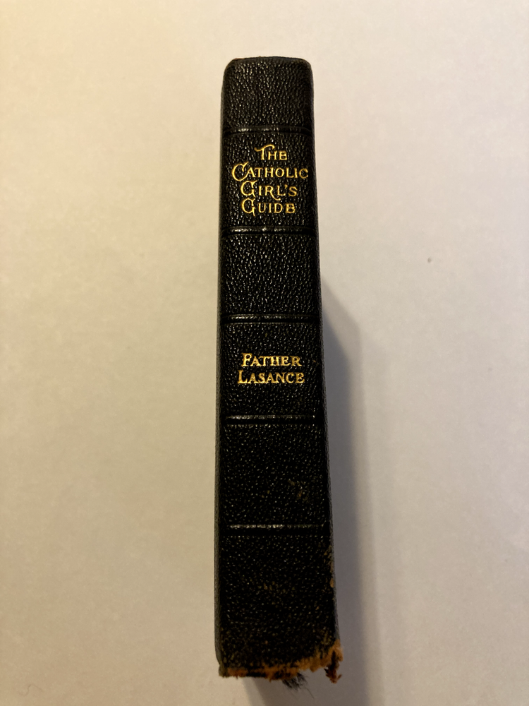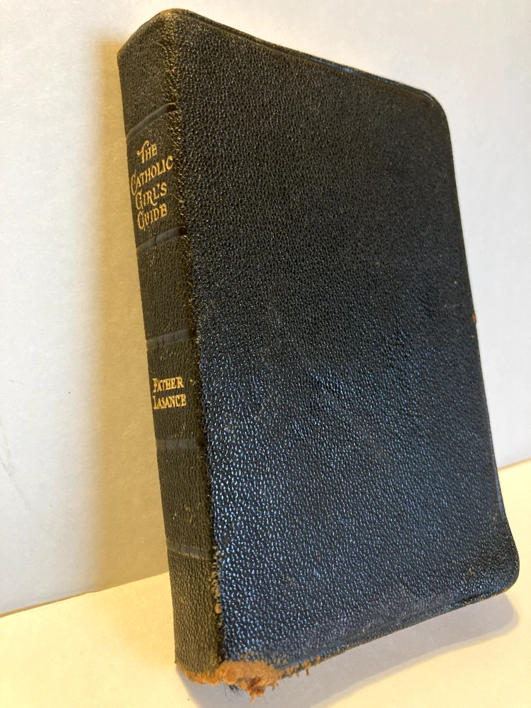 Original edition from 1906 Bonded leather cover with gilt patterned edge stamped on inside of front and back covers. Gilded text block edges. Previous owner's signature on flyleaf. 1906 681 pages 3.5" x 5.5" In this guide Fr. Lasance provides instructions and devotions for young ladies on acquiring Catholic virtues and living out their Catholic Faith.