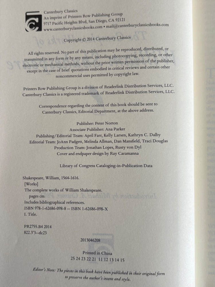 The Complete Works of - Leather Bound -by Shakespeare William - College Edition This book is in like new condition. It has a mark on the side. Please view photos for additional details.