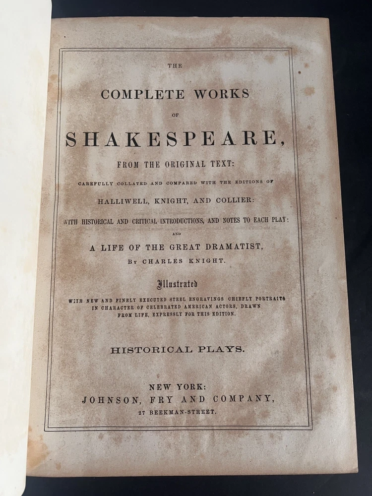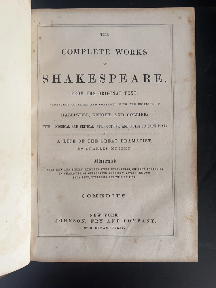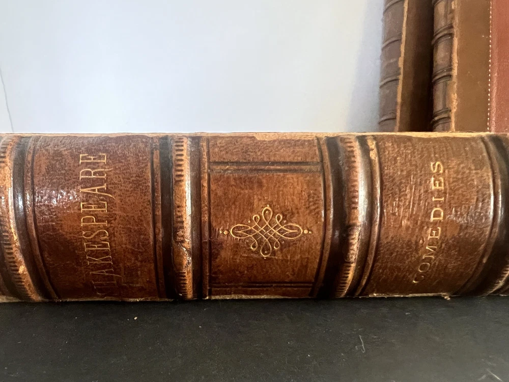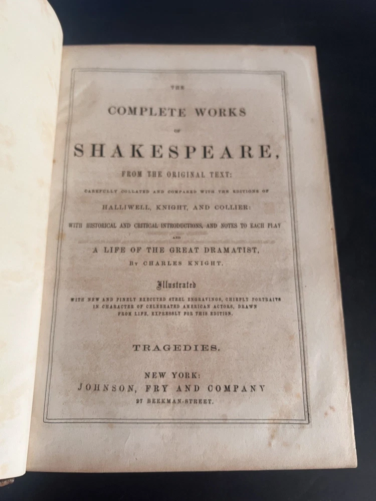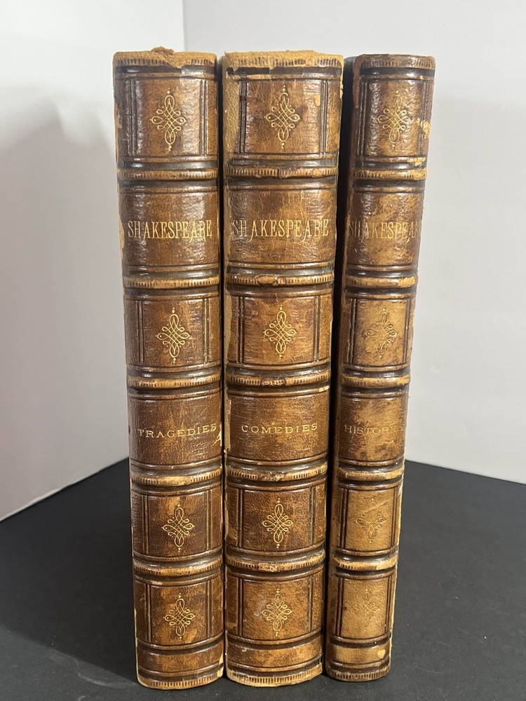 Don't miss this opportunity to own a beautiful, classic piece of Literary history ~ Complete 3 volume set....Comedies Histories, Tragedies. Not dated. Probably late 1800's. Hardcover leather bound. All spines intact. A couple have some age/moisture damage (see pics). Beautiful etchings with tissue paper covers. No dog ears or torn pages. Nice aged leather look. Books are in great condition for their age. Some bleed over and age spots. Covers are in good condition. Over all a really nice set!! SEE PICTURES. More pics available if needed. FREE SHIPPING via USPS Media Mail.