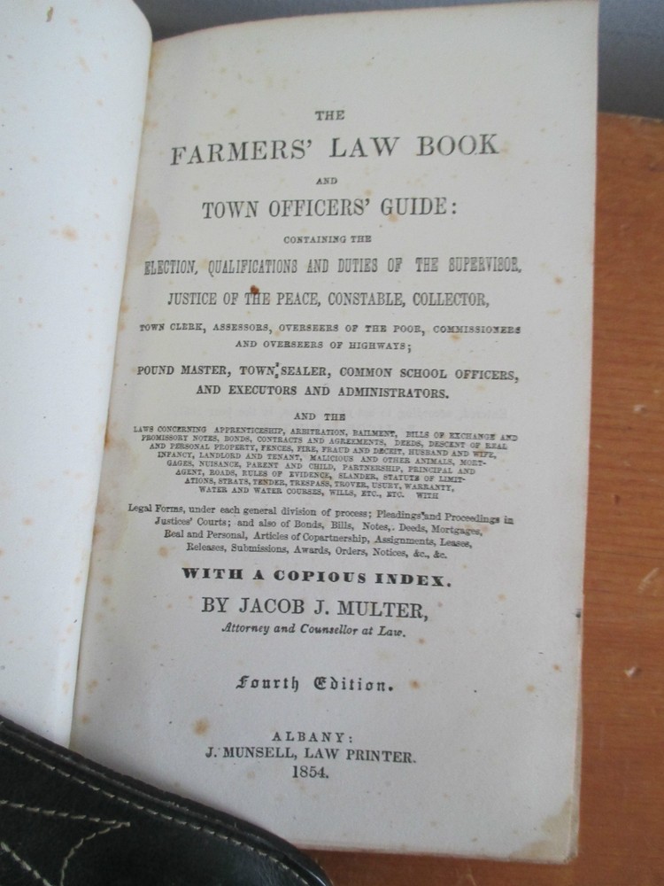 The FARMERS' LAW BOOK And Town Officers' Guide: containing the election, qualifications and duties of the supervisor, justice of the peace, constable, collector...and the laws concerning apprenticeship, arbitration, bailment...with a copious index by Jacob J Multer was published 1854 in Albany by J Munsell, Law Printer, 4th edition measuring 7 1/2" x 4 3/4" with leather binding and 394 pages. Covers worn at extremities and chipped at spine ends; outside hinge leather splitting; name and student award penciled inside covers and on front endpaper; light foxing; a few signatures protruding from fore edge; otherwise solid and clean. Thank you.