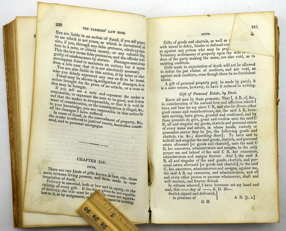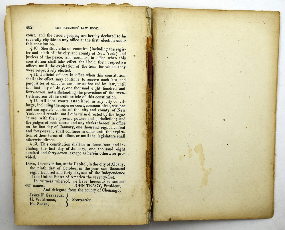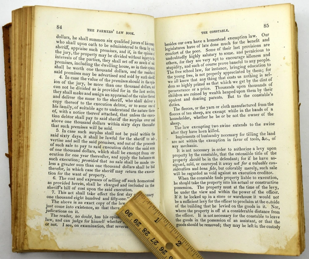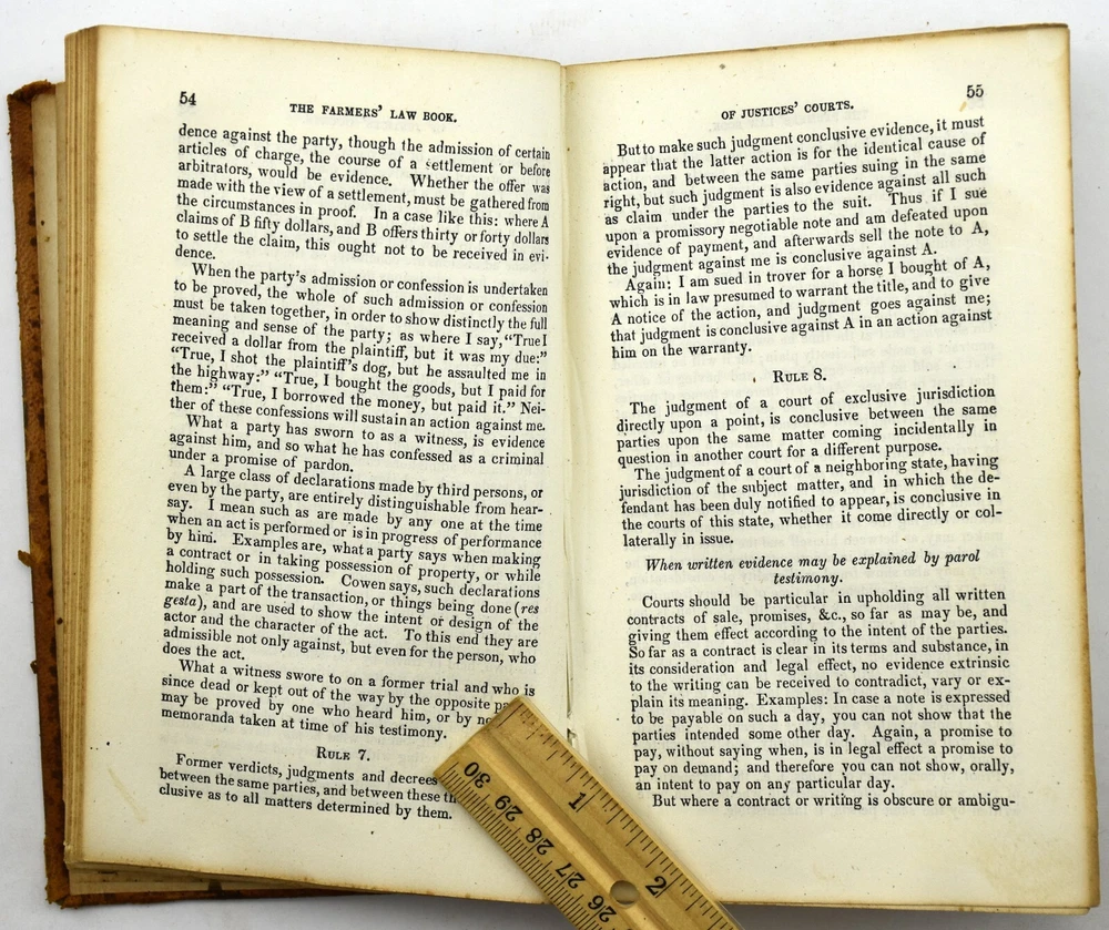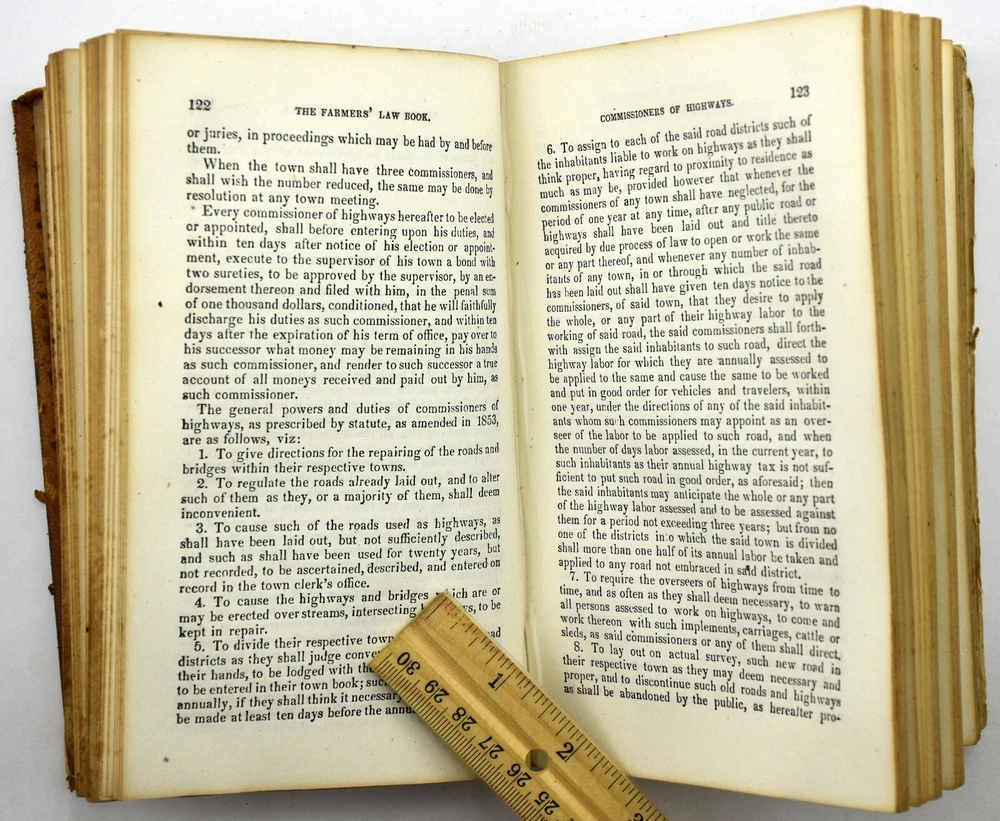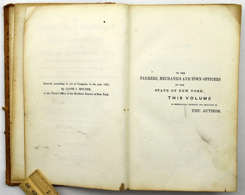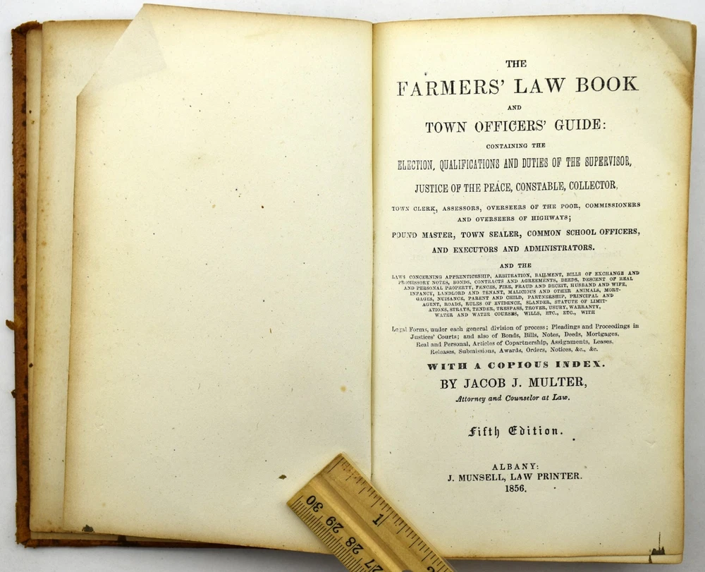 big daddy Y-2074 The FARMERS' LAW BOOK & Town Officers' Guide by Jacob Multer, 1856 Leather BOOK CONDITION: * I price my books to sell and try to describe the condition to the best of my ability. I am certainly no book buff. However, each person has a different opinion of what “Very good", "Good", or even "Acceptable" condition is. Ebay gives us guidelines on the definition of each condition, but everyone does not follow those guidelines. Book Smell: None Mild Distinct Strong Very Strong Overall Condition: Book is in acceptable condition. Book Cover Condition: Front cover: Has stain(s) on the middle; Has marking(s) on the middle; Corners are a bit worn. Rear cover: Has rip/tear(s) on the middle. Binding cover: Has rip/tear(s) on the upper left-hand corner, upper right-hand corner, middle and lower right-hand corner; Front cover has detached from binding along upper half and lower half; Rear cover has detached from binding along upper half and lower half. Front cover looks normal for a leather surface. The rear cover is completely missing. Binding Condition: Binding is holding pages fine, but the binding holding the covers is completely comprised and gone. See photos Pages Condition: Some pages have stains, rips/tears or markings; Front pages contain some kind of inscription. Pages are a bit rough, but still a readable book. Color of book: Book is colored brown. Number of pages: 402 Questions??: Please eBay message me with any questions you have about any item. I will respond within 12 hours of your question. If you would like additional photos taken of an item, please request that through eBay messages as well. Payment: I utilize eBay managed payments for different payment methods. Please reference the different options eBay provides above. Shipping: This item will be shipped via USPS Media Mail by default. There are other choices during checkout. Returns: I do accept returns.