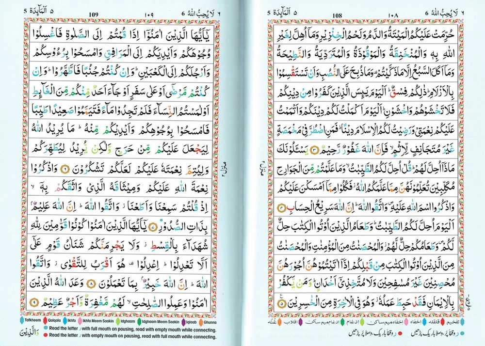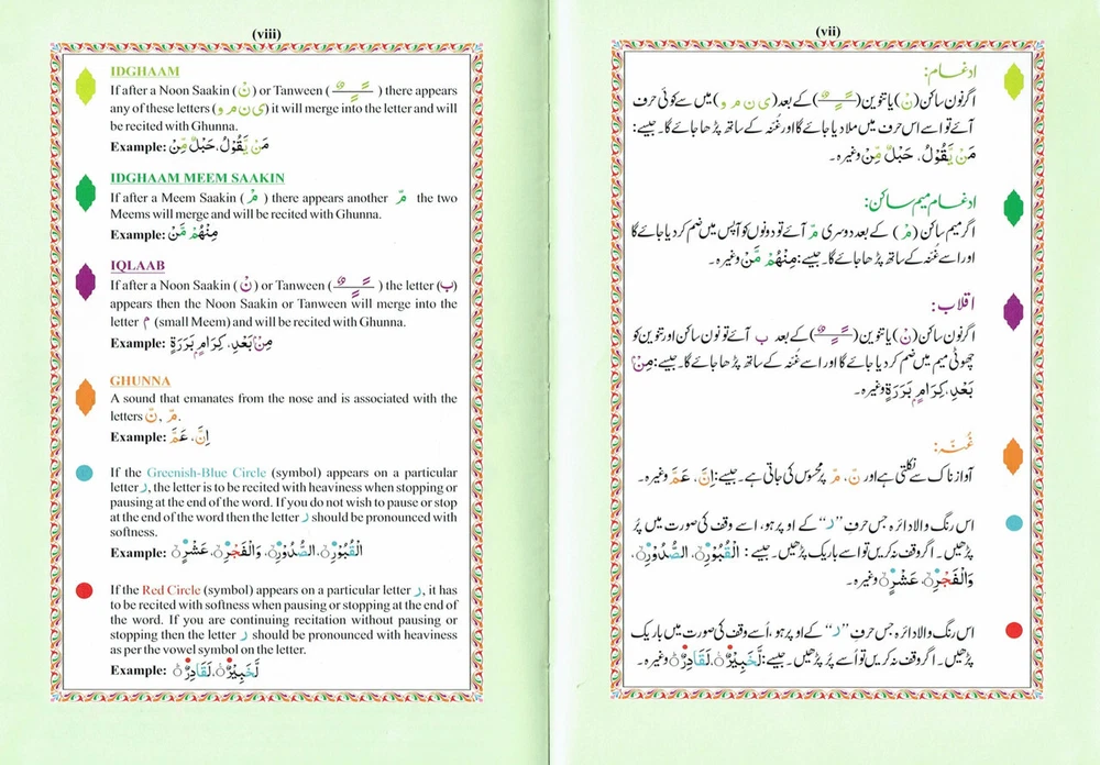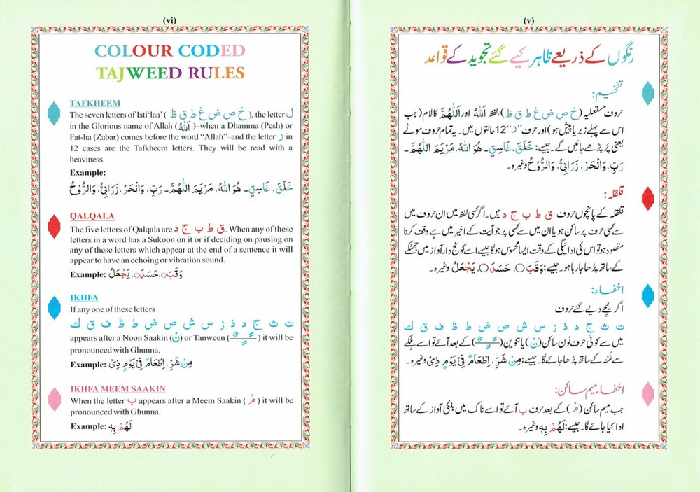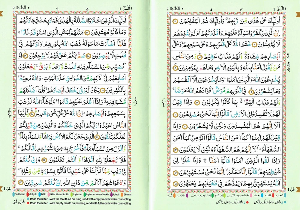 The Holy Quran Colour Coded Tajweed Rules Premium Leather Flexi-Bound Ref 123-CC Flexi Cover, Arabic language,(15 Lines) Tajweed Rules Expalined in English and Urdu Language Holy Quran No.123-CC Flexi with Slip Case ISBN:9789351691112Author: Allah Binding: Flexible Cover With Hard Case Pages: 618 Size: 7.7 x 5.6 x 1.1 inch Publication Year: 2021 Description About This Book: The Holy Quran Colour Coded Tajweed Rules with Colour Coded Manzils is a specific edition of the Quran with two unique features: Tajweed rules and Manzils, both color-coded for simple reference and application. Rules for Tajweed: Tajweed refers to principles for flawless Quran recital. It includes exact requirements for letter pronunciation, intonation, and articulation, as well as directions for pause length, repetition percentage, and other elements of recitation. The Colour Coded Tajweed edition of the Quran brings attention to these rules by giving various Tajweed components a particular colour. This graphic assistance helps readers recognise and follow the proper Tajweed guidelines when reciting the Quran. Premium Leather Flexi-Bound: This edition has an excellent leather binding that is both flexible and strong. The Quran remains secure and shielded by the Flexi-Bound cover, that makes it simple to hold and open during recitation or study.