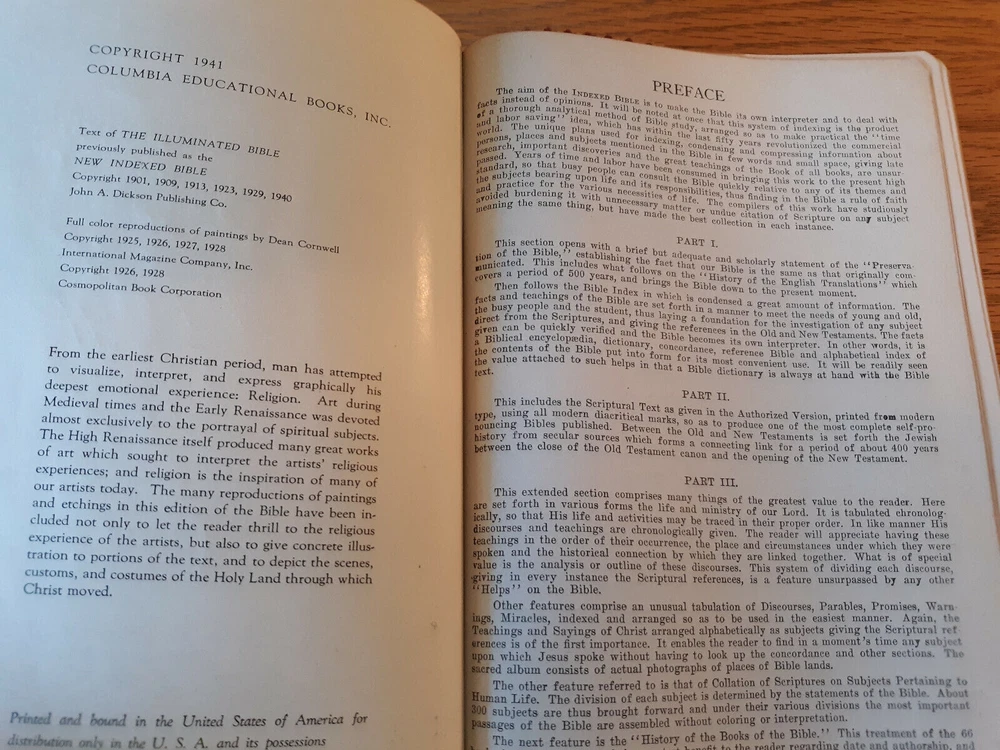 The Illuminated Bible 1941 Text Authorized KJV Indexed Columbia Educational Books There is some wear to the cover. The book has wear on the corners. There may be some marks in or on the book. Books are stored on a bookshelf in A/C. They are in a dark room and are well maintained. If you have any questions or concerns about this book please contact me. Listing and template services provided by inkFrog