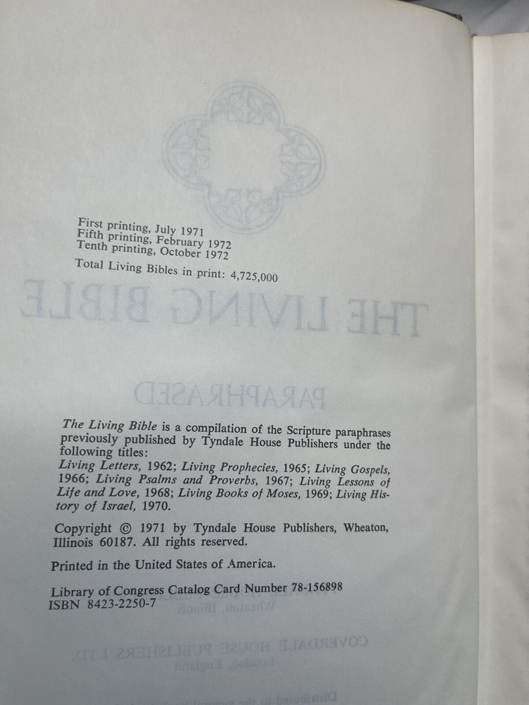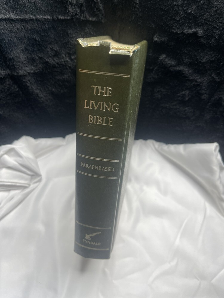 The product is a vintage 1971 edition of "The Living Bible" published by Tyndale House. It is a nonfiction manual written by Jesus, with a green padded hardcover and inscribed by the author. This book is a paraphrased version of the Bible, specifically designed for adults with a focus on Christianity, Jesus Christ, and spiritual teachings. The book is in English, published in the 1970s in the United States, making it a valuable piece for collectors and those interested in religious studies.