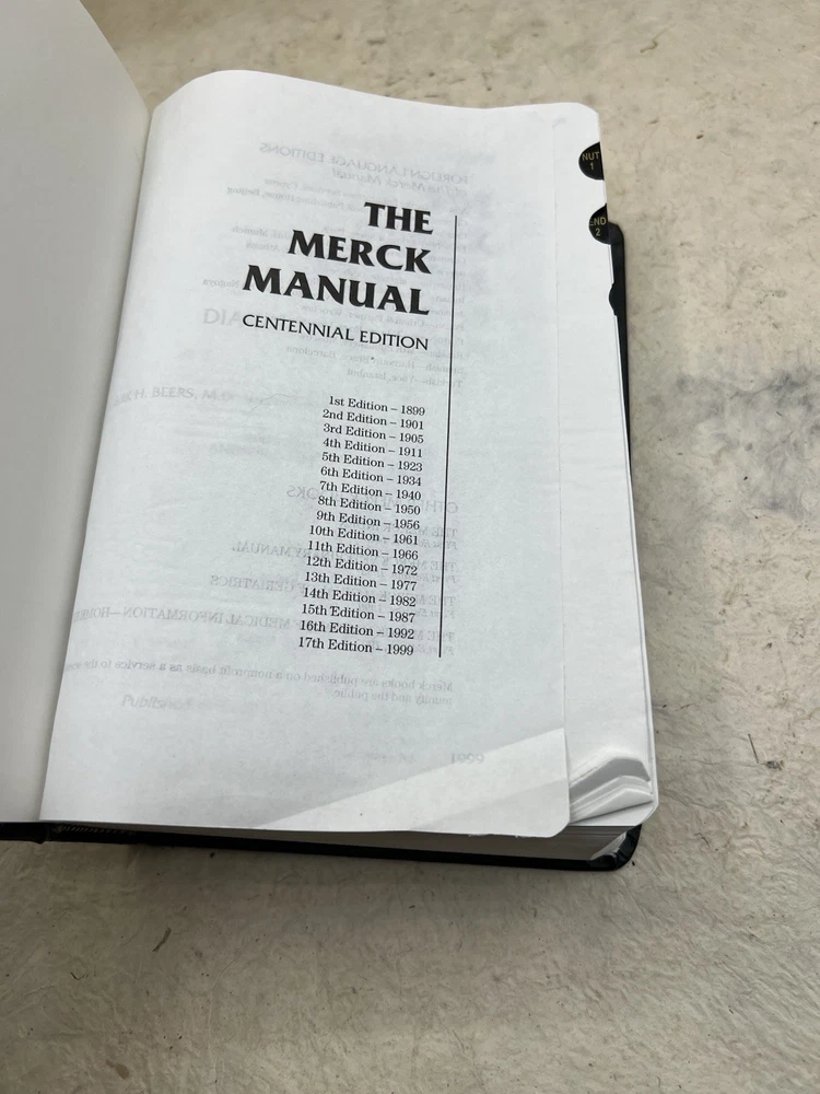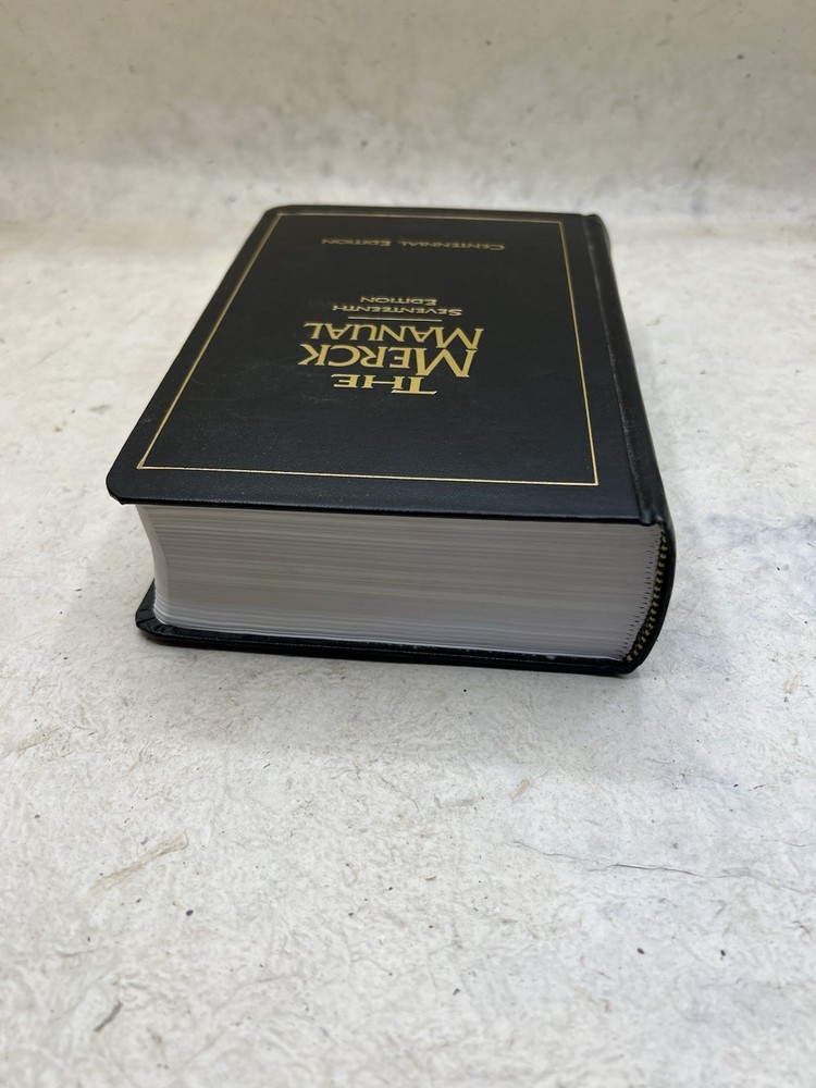 The MERCK Manual 17th Edition Centennial Edition is a vintage, hardcover book that contains a wealth of information on medicine and medical nursing. Published by Merck Research Laboratories in 1999, this special edition features faux leather binding, illustrations, and is part of a historical series. With a total of 2833 pages, this scientific manual is intended for young adults and adults interested in the fields of health, treatments, and pharmacology. The book's narrative type is nonfiction, making it a valuable resource for those seeking knowledge in the realm of medicine.