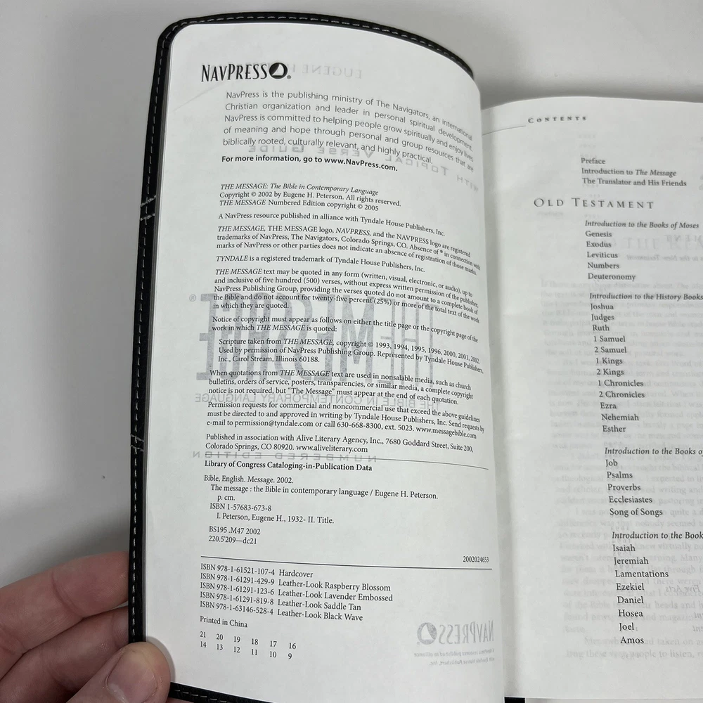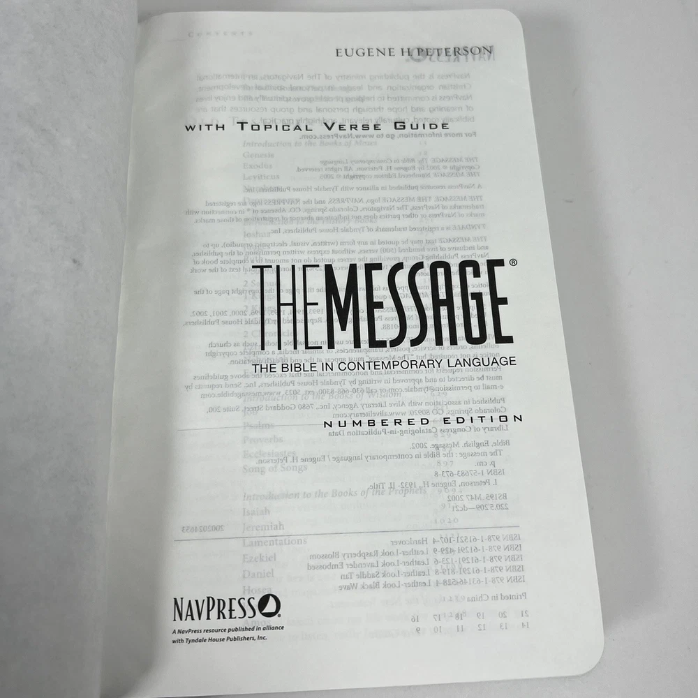 The Message Personal Size : The Bible in Contemporary Language Eugene Peterson. Condition is Pre-Owned (Very Good). Shipped with USPS Media Mail. Please see the photos for product condition. Thanks! Features - Easy to carry on the train, to the coffee shop. - Introduction teaches how best to approach a 'reading Bible'. - Topical Concordance on more than 80 topics. - Includes 'The Story of the Bible in Five Acts'. - Book introductions at your fingertips. - Charts and maps. - Satin ribbon to mark you place. - Rugged yet refined leather-look covers. - Generous 8-point text size.