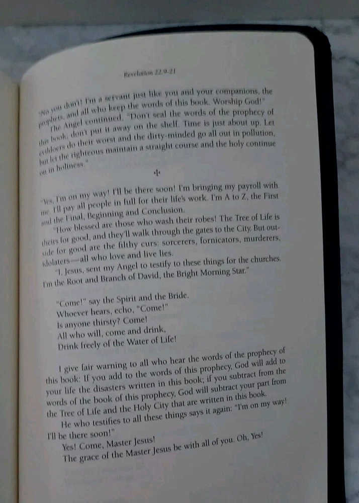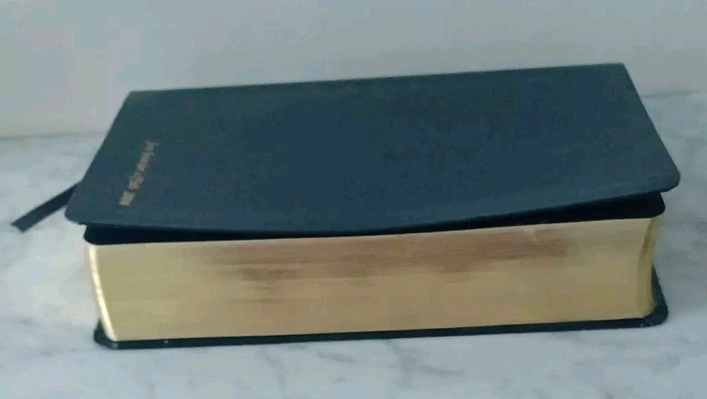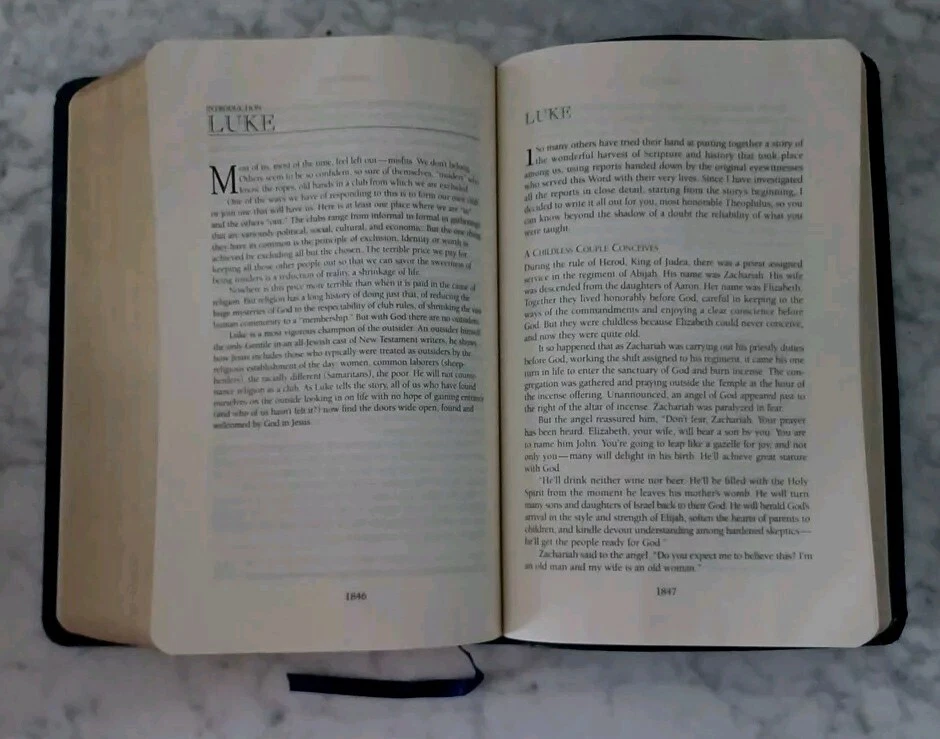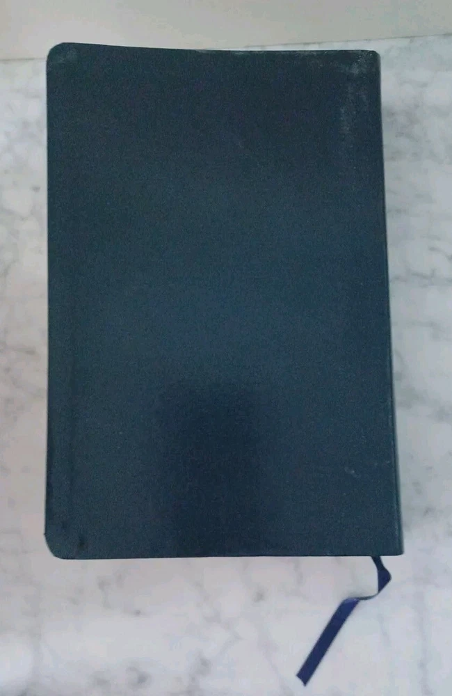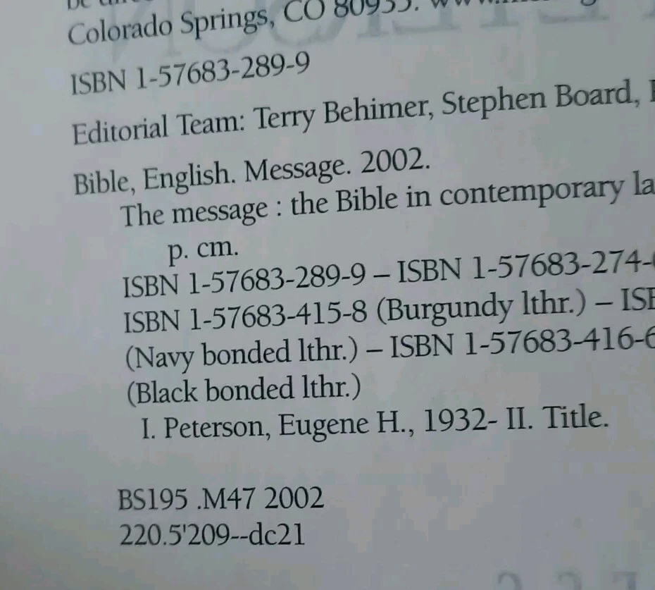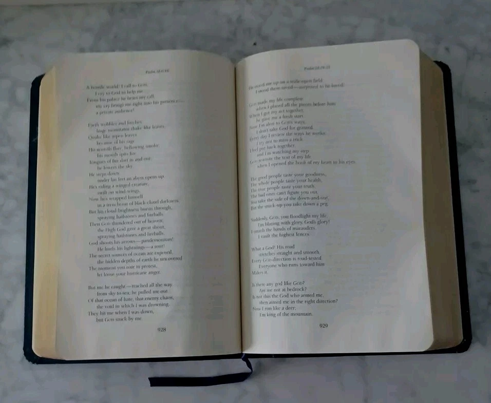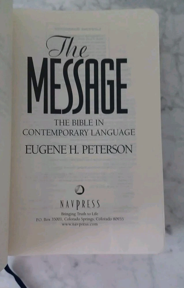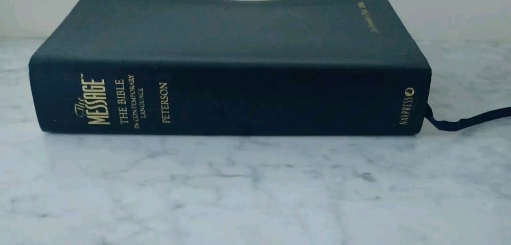 This book is a contemporary translation of the Bible by Eugene H. Peterson. It is bound in faux navy leather. It has a length of 9 inches, a width of 6 inches, and a height of 1.5 inches, with a weight of 48 ounces and 2272 pages. The book is intended for a wide range of audiences, including young adults, ages 9-12, and adults. It is ingraved and has a note from a pastor on the 1st page. Photos are included. The Bible is in excellent condition, looks unused.