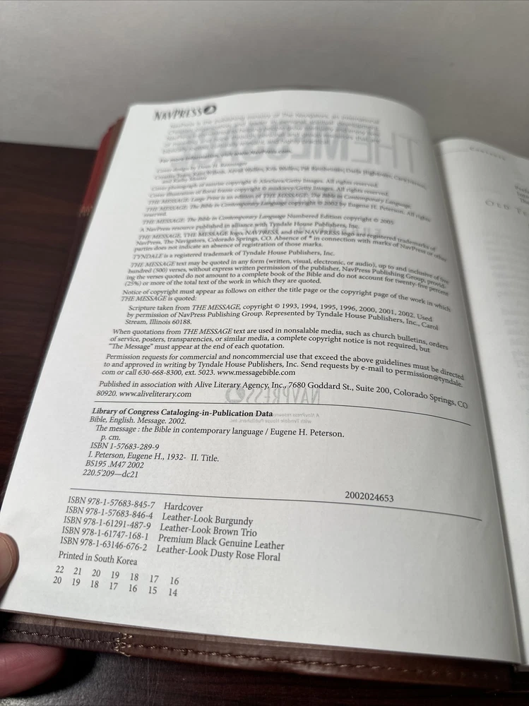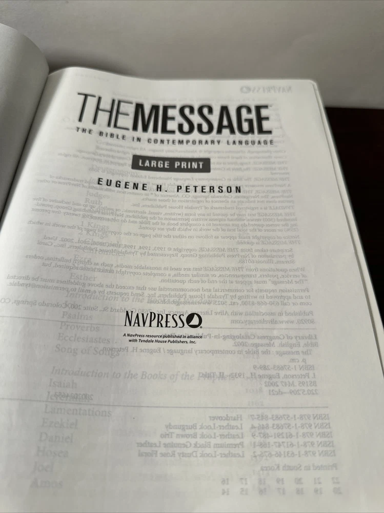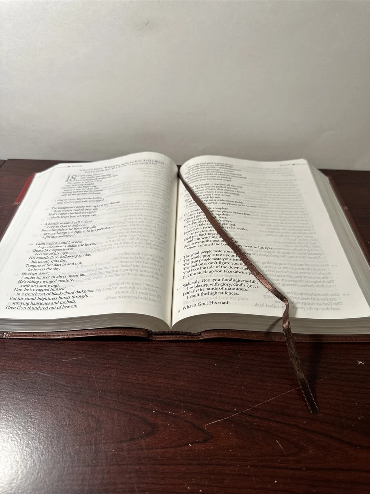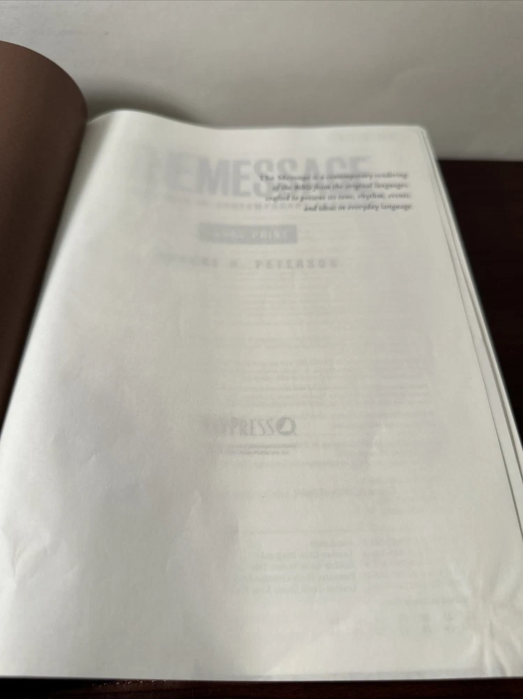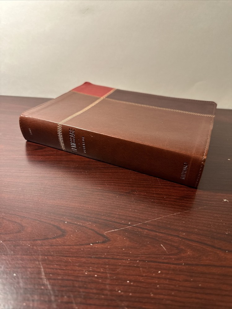 The Message | The Bible in Contemporary Language | Brown / Red Leather Soft**. Bible is used. In good condition. Large print. There are a few wrinkled pages in the Bible. no highlighter marks, or pen marks can be seen when thumbing through the Bible. Very soft, smooth cover. Great print for reading and low strain on eyes. **this is imitation leather. Shipping see shipping section for price and service Orders are shipped out before 3 business days (If ordering between October 1 to January 31 shipping might have a delivery delay due to influx at the post office.) Unhappy?? We value your time and business. Our goal is always to strive for 100% satisfaction from our customers. So please allow us the opportunity to service you well. If for any reason you are unsatisfied please return for a refund. All items must be in same condition as received in. You must message me with pictures before sending back.