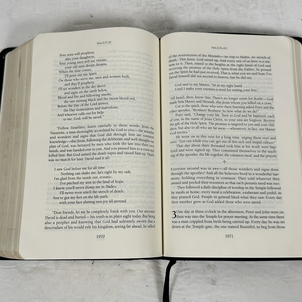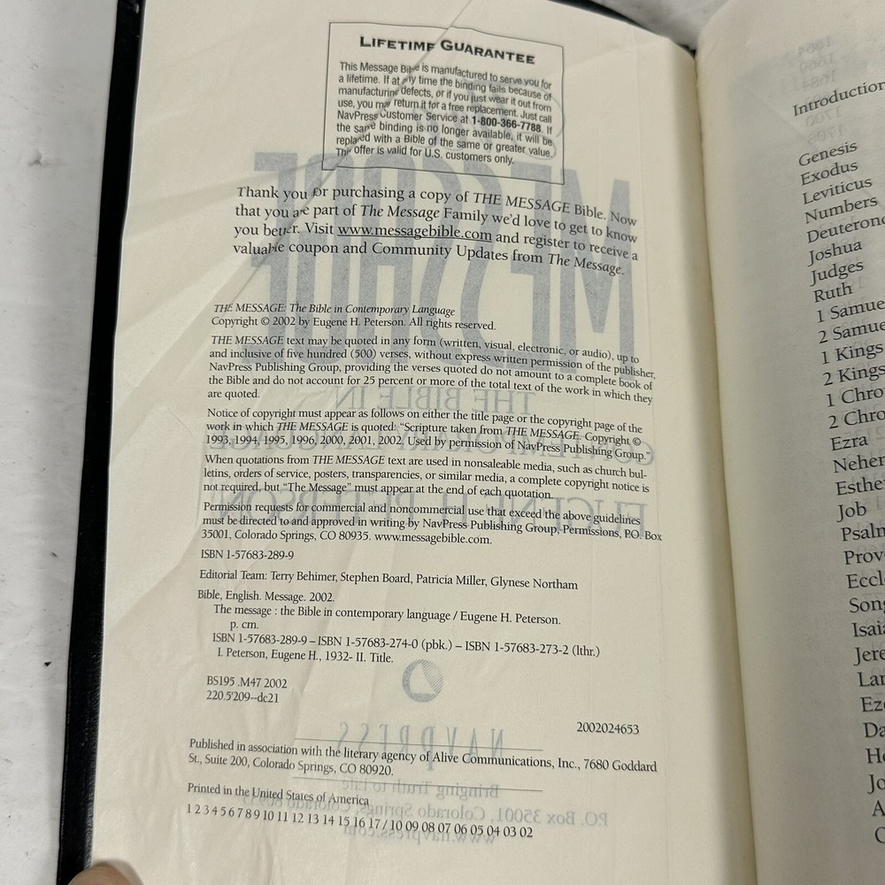 The Message-The Bible in Contemporary Language Eugene Peterson Genuine Leather. This Bible does have some markings in it. Mostly pencil. Please look at all photos as they are part of the description. Fast Shipping