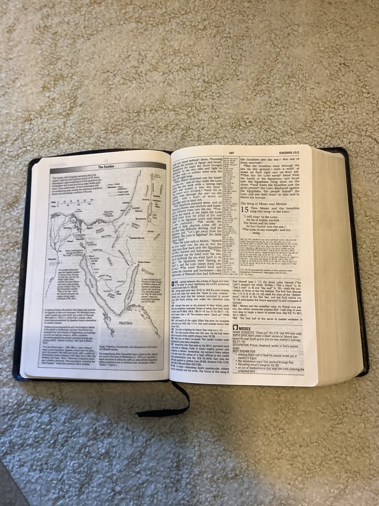 Very nice NIV study bible from Zondervan. Dark blue bonded leather, red letter edition. There is a name embossed on the front but no other writing inside that I could see....