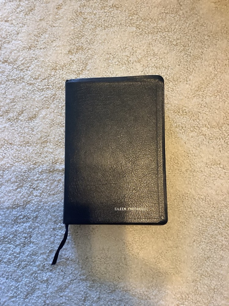 Very nice NIV study bible from Zondervan. Dark blue bonded leather, red letter edition. There is a name embossed on the front but no other writing inside that I could see.