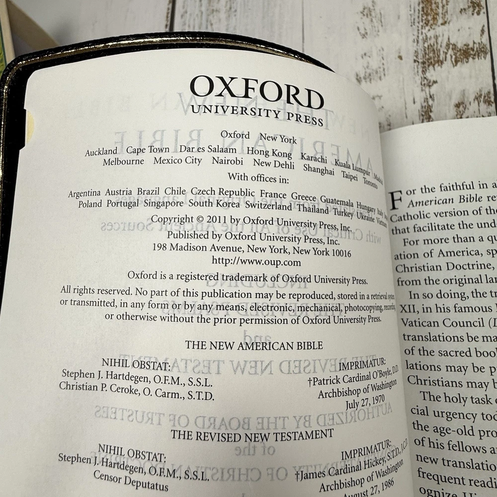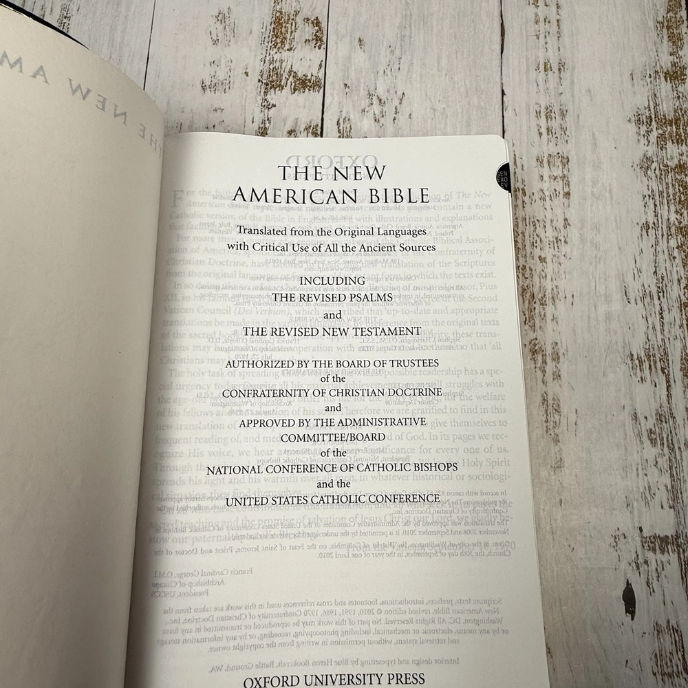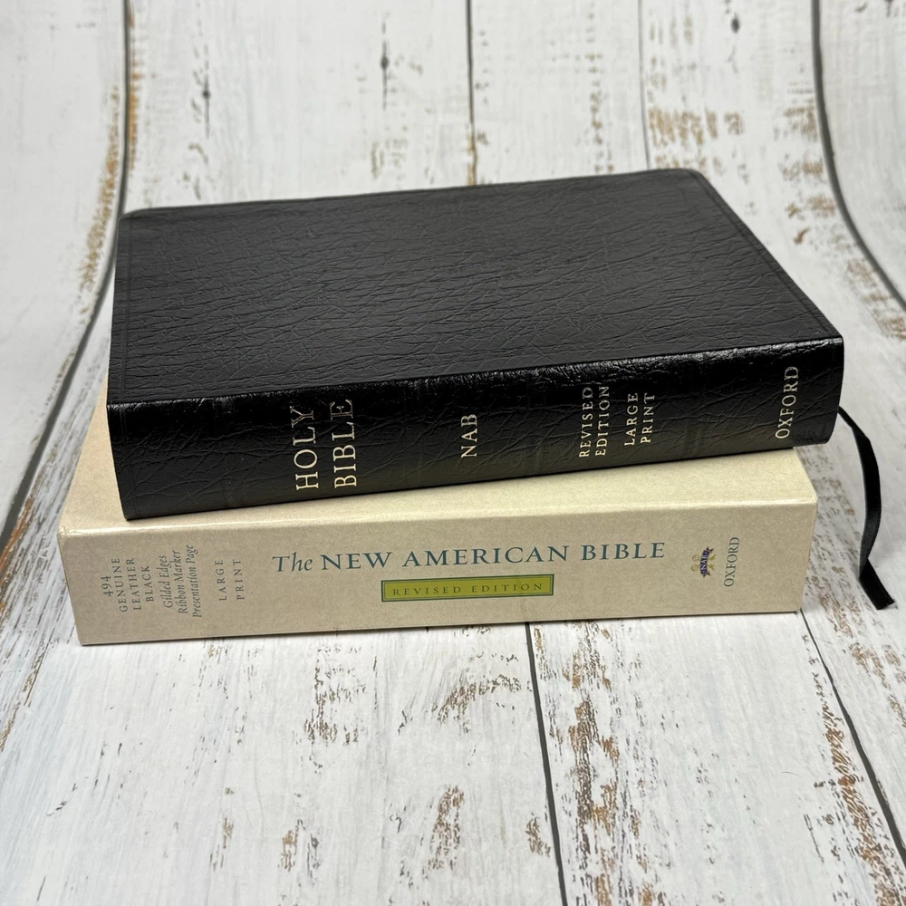 New in the box. Beautiful Bible. The product is a large print, genuine black leather edition of the New American Bible Revised Edition published by Oxford University Press. It is the Revised Edition, containing 2064 pages and measures 9.9 inches in length, 6.6 inches in width, and 2 inches in height. This Bible, with a weight of 50.9 ounces, is suitable for adult education and features a sturdy leather binding, making it a valuable and durable reference for students and individuals seeking a comprehensive and well-crafted Bible for personal use.