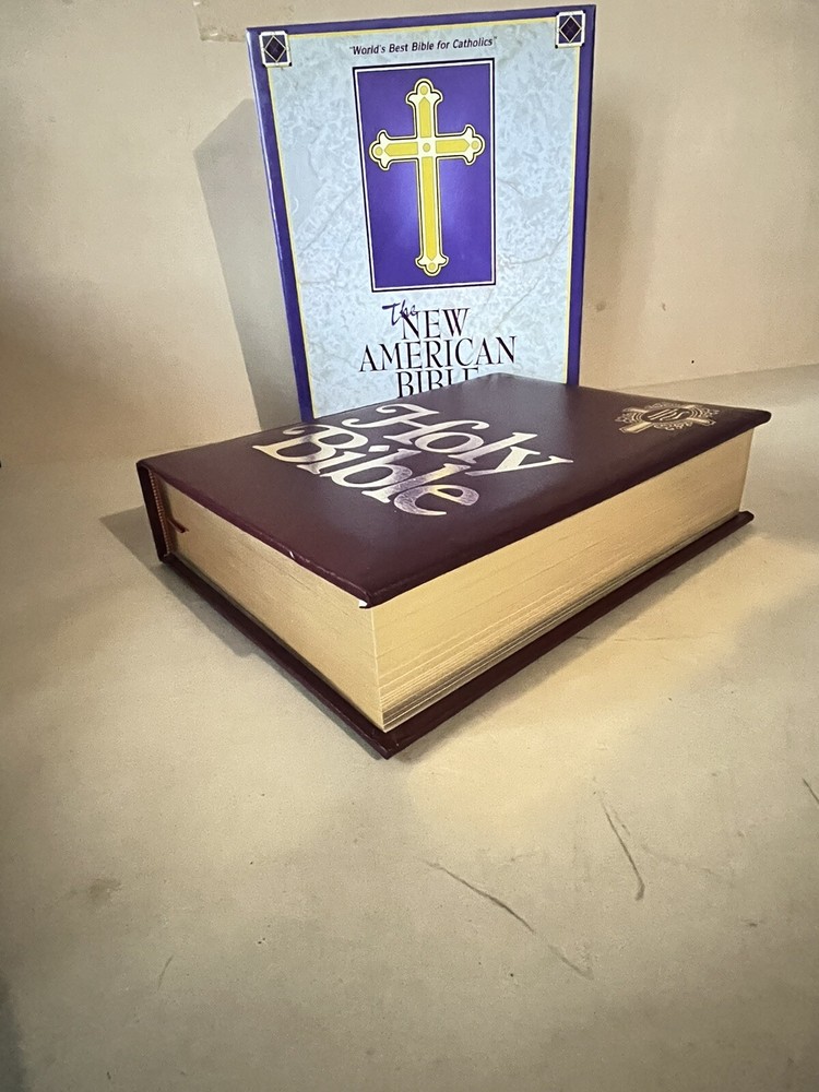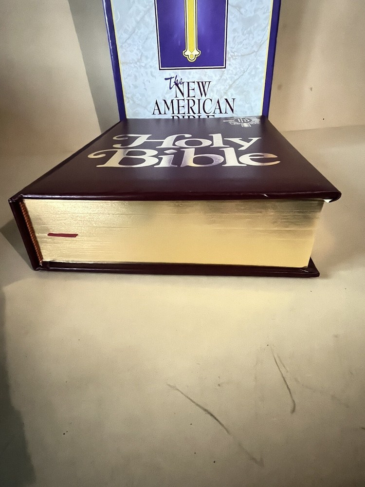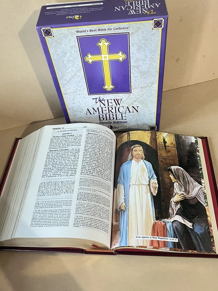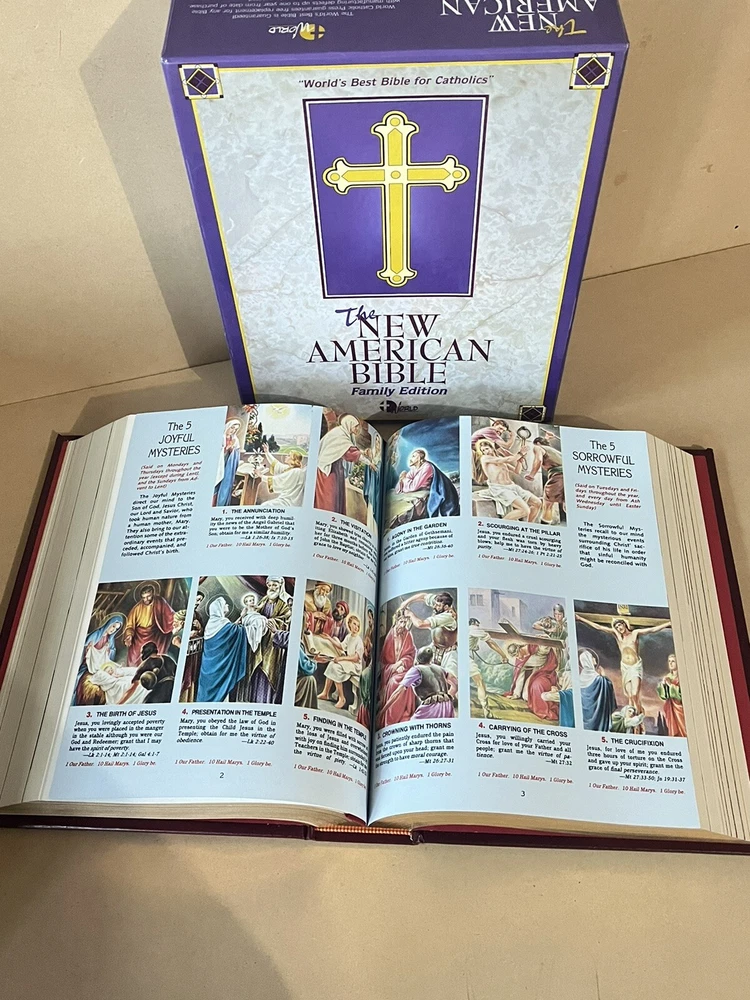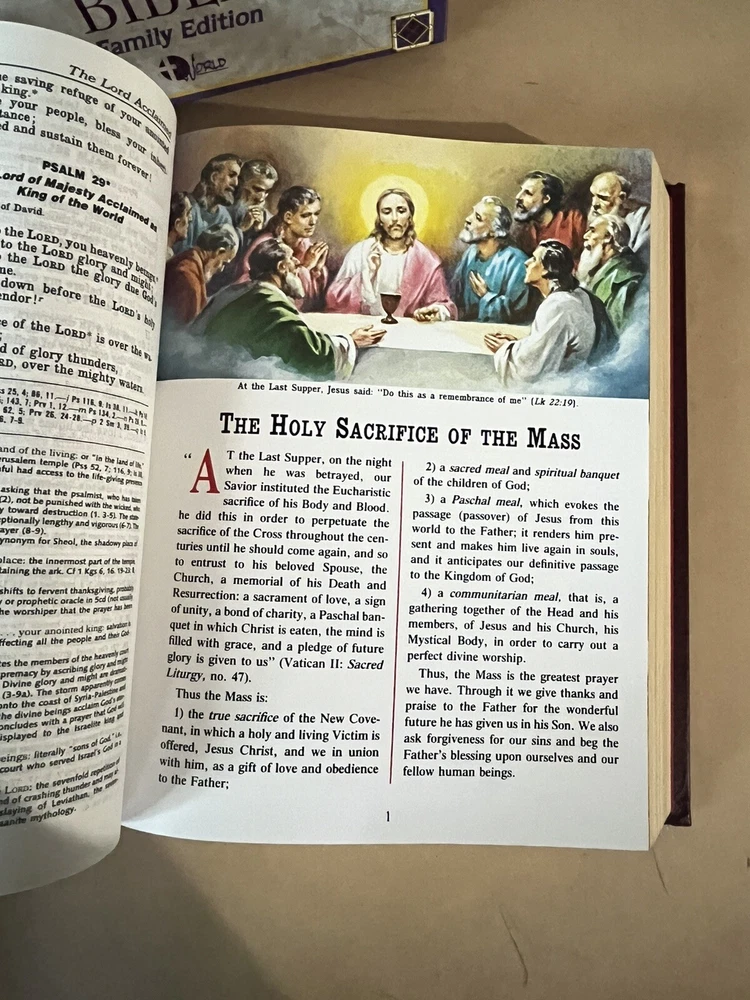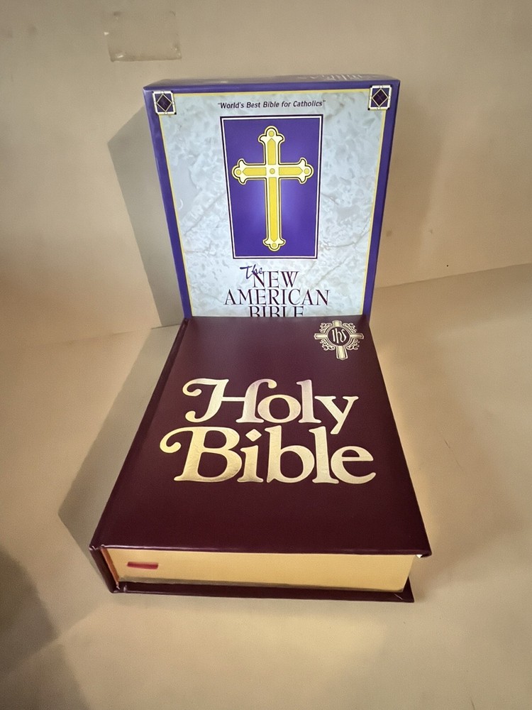 This World Catholic Press Family Edition is a distinguished addition to the New Catholic Bible (NCB) offerings. The translation of the complete Old and New Testaments is fresh, faithful, and reader friendly. This edition boasts a distinctive, easy-to-read, and inviting 13-pt. typeface, the largest of any Catholic Family Bible in a comparable size. Its rich, extensive, and insightful footnotes are in a highly readable font. Intended to be used in Catholic families for daily prayer and meditation, as well as private devotion, this World Catholic Press Edition comes in an impressive page size of 21.5cm(8.46”) x 28cm(11”) format, features gold page-edging; specially designed, full-color end papers; decorative ribbon, and is durably bound in burgundy padded imitation leather. This Bible can be engraved after purchase. Noteworthy Features -Bible Comes In Original Box. -(LxWxH)Overall 22.6x29.3x7cm -1792 Pages. -Decorative Presentation Page. -Dignified Family Record Section. -Chronological Tables of Bible History. -Learning about Your Bible Section. -Over 100 Full-Color Photographs and Illustrations. -8 Full-Color Maps -Illustrated Rosary and Stations of the Cross. -Distinctive Illustrations Introduce Many Books. -Words of Christ in Red -Books of the Bible by Religious Tradition Miracles and Parables of Jesus. -Valuable Bible Dictionary -List of 3-Year Sunday Mass Readings -Doctrinal Bible Index -Exquisite Full-Color End Papers