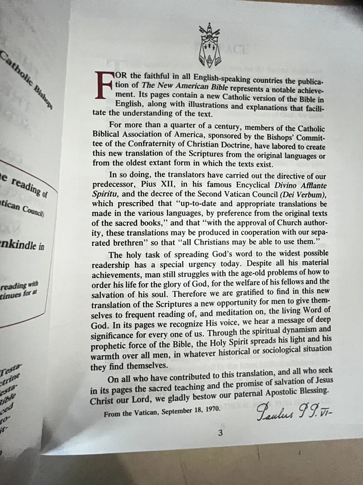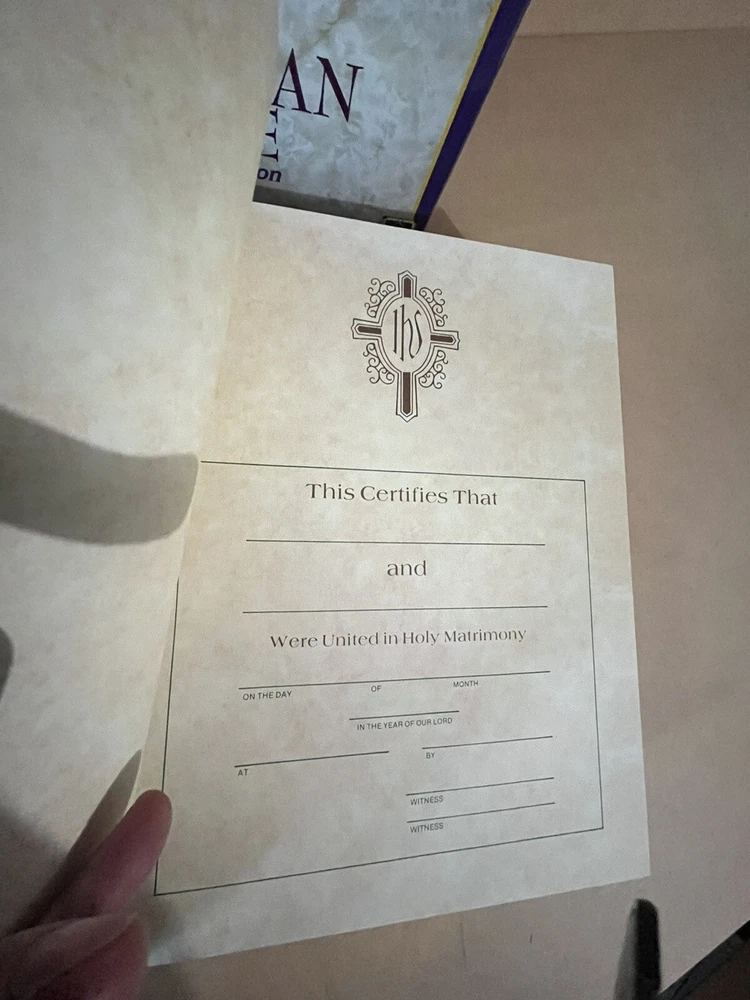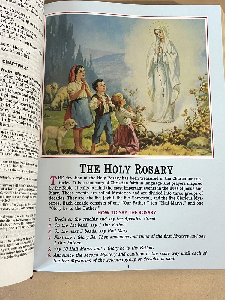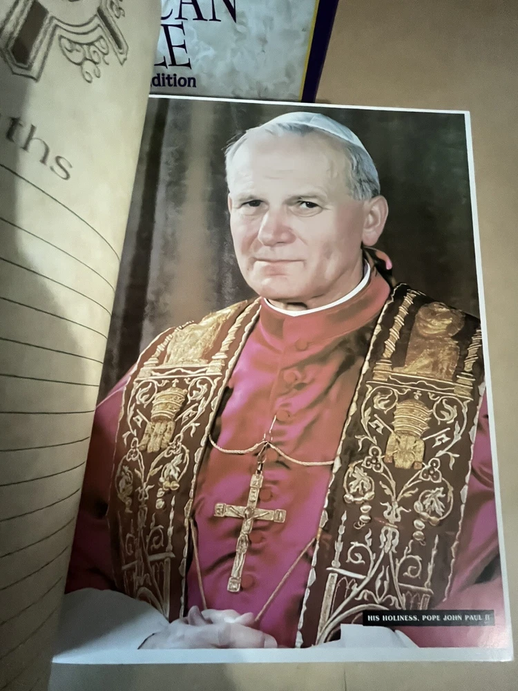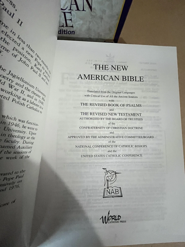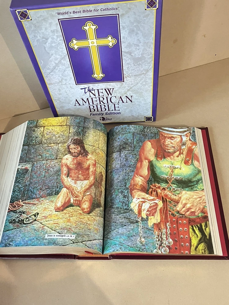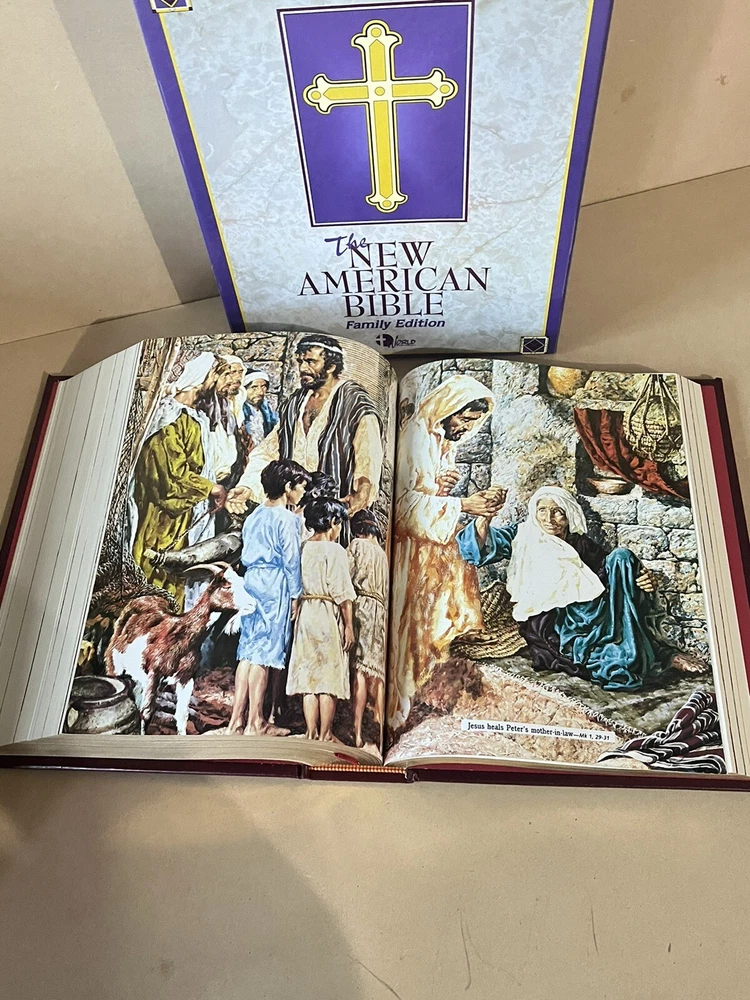 This World Catholic Press Family Edition is a distinguished addition to the New Catholic Bible (NCB) offerings. The translation of the complete Old and New Testaments is fresh, faithful, and reader friendly. This edition boasts a distinctive, easy-to-read, and inviting 13-pt. typeface, the largest of any Catholic Family Bible in a comparable size. Its rich, extensive, and insightful footnotes are in a highly readable font. Intended to be used in Catholic families for daily prayer and meditation, as well as private devotion, this World Catholic Press Edition comes in an impressive page size of 21.5cm(8.46”) x 28cm(11”) format, features gold page-edging; specially designed, full-color end papers; decorative ribbon, and is durably bound in burgundy padded imitation leather. This Bible can be engraved after purchase. Noteworthy Features -Bible Comes In Original Box. -(LxWxH)Overall 22.6x29.3x7cm -1792 Pages. -Decorative Presentation Page. -Dignified Family Record Section. -Chronological Tables of Bible History. -Learning about Your Bible Section. -Over 100 Full-Color Photographs and Illustrations. -8 Full-Color Maps -Illustrated Rosary and Stations of the Cross. -Distinctive Illustrations Introduce Many Books. -Words of Christ in Red -Books of the Bible by Religious Tradition Miracles and Parables of Jesus. -Valuable Bible Dictionary -List of 3-Year Sunday Mass Readings -Doctrinal Bible Index -Exquisite Full-Color End Papers
