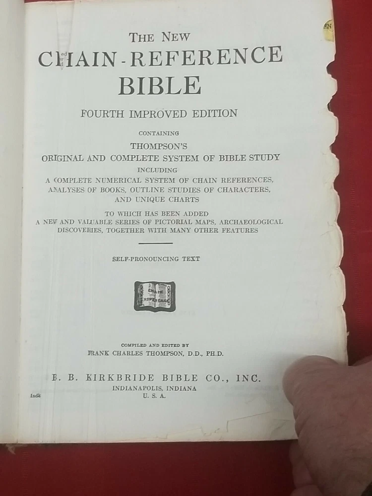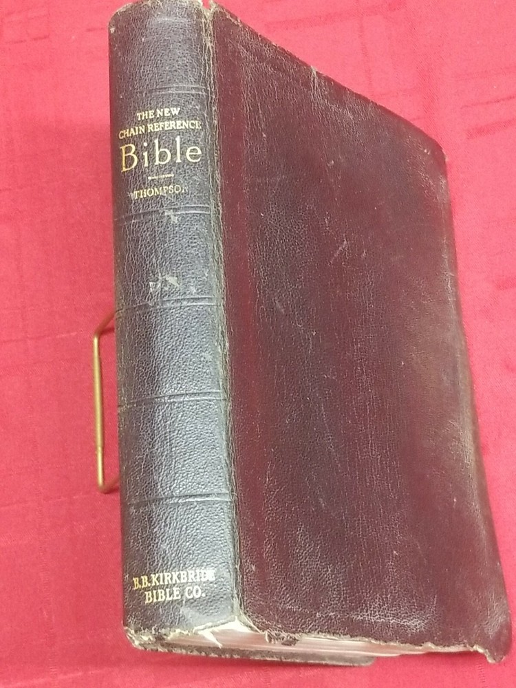 The New Chain Reference Bible Thompson 4th Improved Edition, B.B. Kirkbride 1964. This Bible is used. It has defects with the binding. Please see the photos. It also has highlighting and underlining (mostly in the New Testament) The Bible appears to be complete. The condition is acceptable for use. Imported Morocco Leather. The New Chain Reference Bible Thompson 4th Improved Edition, B.B. Kirkbride 1964. Weight is 2 lb. 5 oz. without packaging. 6¾" x 9" x 1¾" Offers always considered. Thank you for looking. PS1-3a.4522.34.9