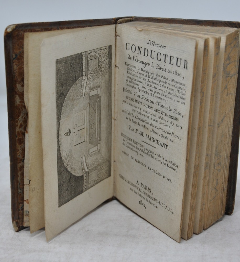 The new driver from abroad to Paris 1820. Marchant de Beaumont (François) .Moronval, 1820. In-16, -basane brunette thick, smooth back ornate, 15-316-36 pp. Frontispiece and 2 inset boards. . Eighth edition of this guide "containing the description of the palaces, monuments, buildings, museums and libraries of this capital. Preceded by a specific in the history of Paris of an instruction to foreigners on how to follow their affairs there, and to live there properly to their fortune: followed by the description of the surroundings of Paris Beautiful copy The new driver from abroad to Paris 1820. Marchant de Beaumont (François) .Moronval, 1820. In-16, -basane brunette thick, smooth back ornate, 15-316-36 pp. Frontispiece and 2 inset boards. . Eighth edition of this guide "containing the description of the palaces, monuments, buildings, museums and libraries of this capital. Preceded by a specific in the history of Paris of an instruction to foreigners on how to follow their affairs there, and to live there properly to their fortune: followed by the description of the surroundings of Paris Beautiful copy