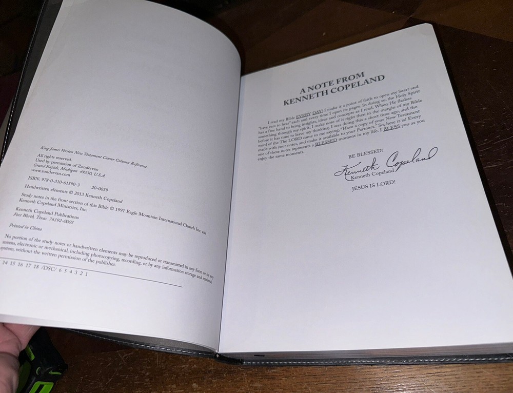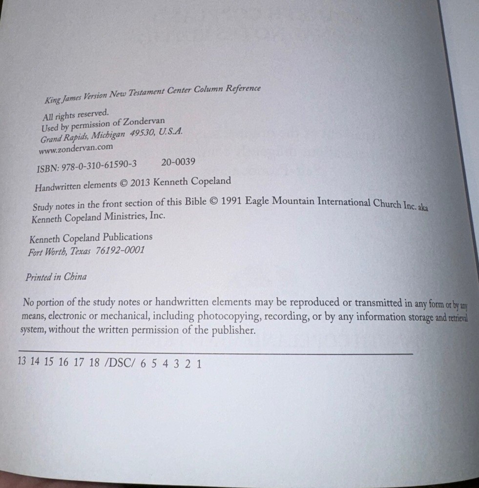 Bible has some wear on the edges This Bible is a one-of-a-kind edition with tons of references and red letter text. It has been personally highlighted by Kenneth Copeland and features a faux leather bound cover. The book contains 592 pages and is the New Testament KJV version. It is in excellent condition and is sure to be a treasured addition to any collection. The book is 10.9 inches in length, 7.1 inches in width, and 1.5 inches in height. It was published in 2013 by Harrison House Publishers in China. The book is intended for young adults and adults, and is perfect for anyone interested in religion and beliefs, religion and spirituality, or Kenneth Copeland.