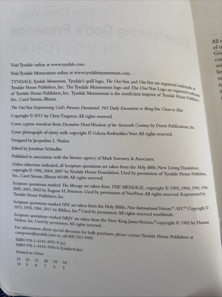 This beautiful devotional book, "The One Year Experiencing God's Presence Devotional: 365 Daily Encounters" by Chris Tiegreen, is a must-have for anyone seeking to deepen their spiritual life. With 365 daily readings, this book offers a unique experience of encountering God's presence every day of the year. The book is beautifully bound in imitation leather with embroidered features, making it a wonderful addition to any collection. It includes topics such as meditations, Christian life, spiritual growth, personal growth, and prayerbooks. This first edition book, published by Tyndale House Publishers in 2011, is written in English and intended for young adults and adults. With 384 pages and a weight of 17.6 oz, this book measures 8.3 inches in length, 5.4 inches in width, and 0.9 inches in height.