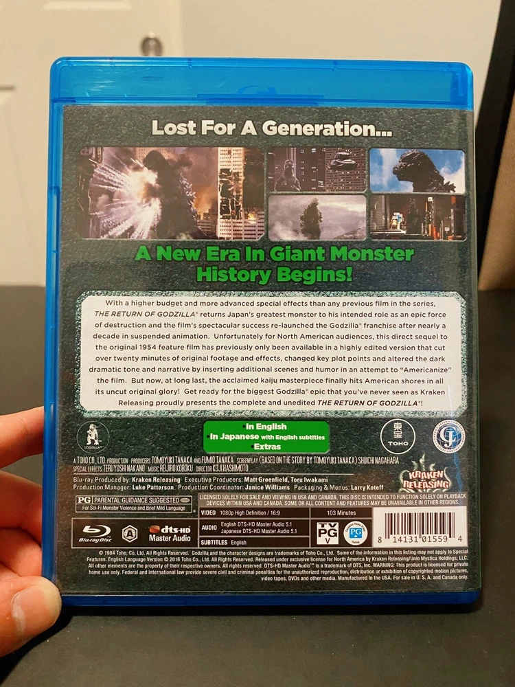 If you’re like me you grew up watching Godzilla 1985 with Raymond Burr on VHS. Little did I know there was another version of the film out there. Presented here is the original Return of Godzilla from 1984 on Blu Ray for the very first time. This rare disc features the original Japanese language with English subtitles and an additional English dub. Mixed with DTS 5.1; feel the wrath of an angry Godzilla right in your living room. If you’ve only seen the American release, you’re in for a much different viewing experience. The disc itself is in terrific condition and hardly been played.