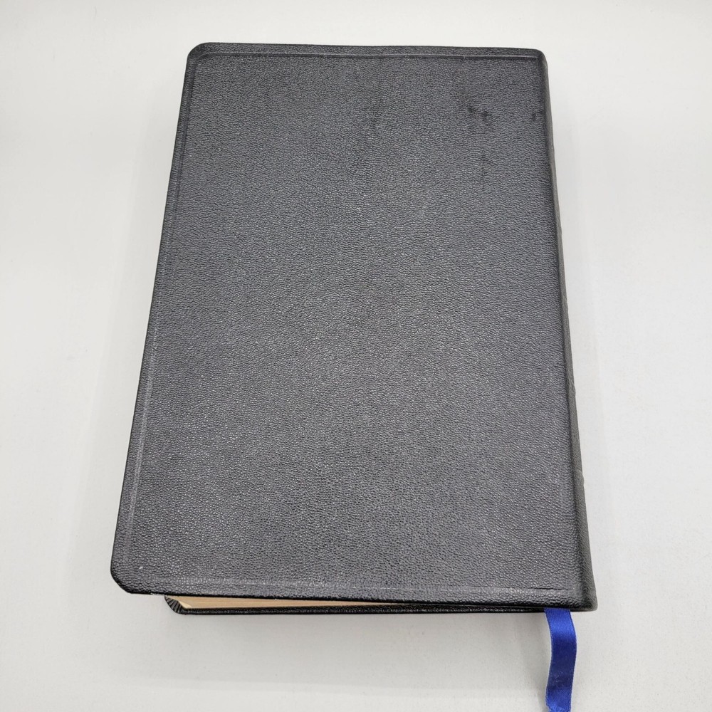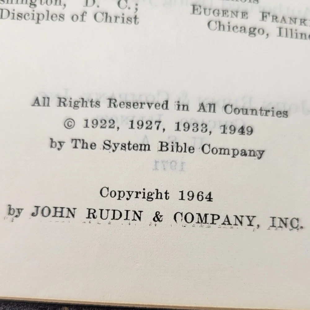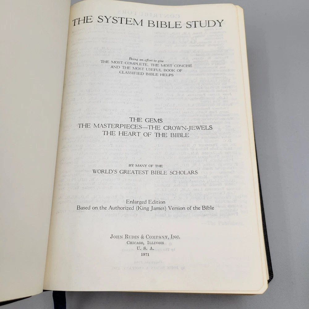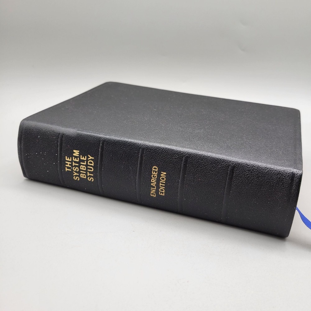 The System Bible Study Enlarged Edition based on the authorized King James Version. Published by John Rudin & Co, dated 1971. Morocco pebbled leather cover. Blue satin bookmark with black and white and color maps. Contains 786 plus pages. Condition - Nearly new condition with no damage or handwriting found. Measures - 9" x 6.5" x 2" BN032325