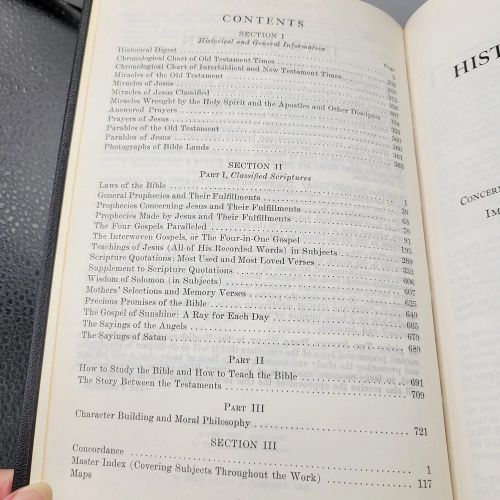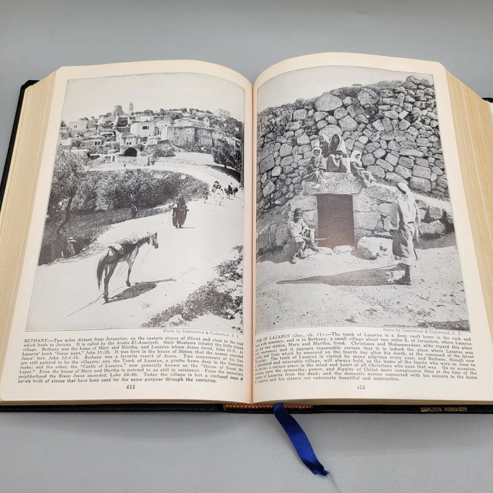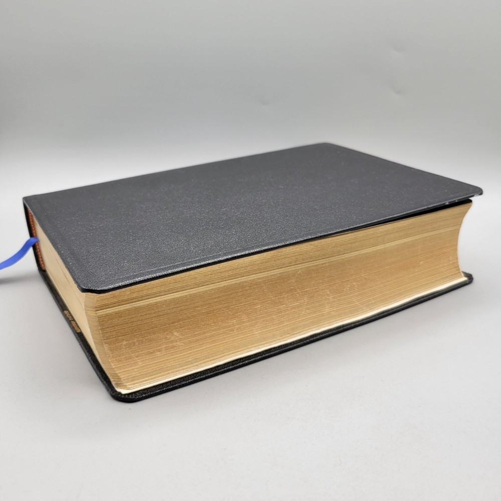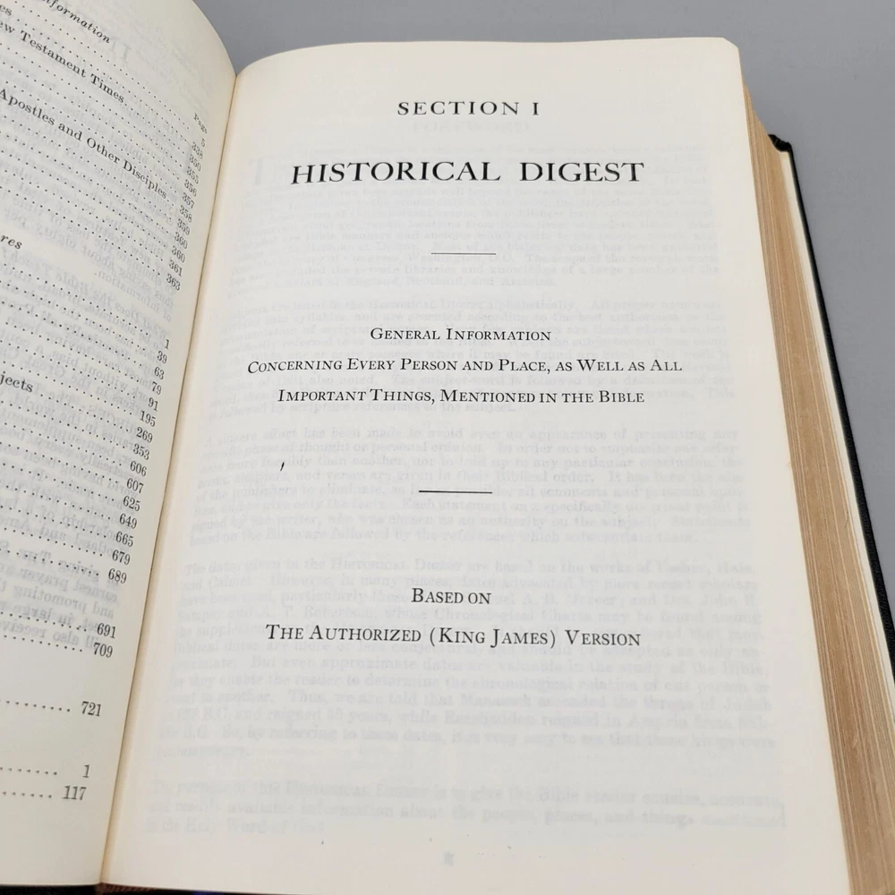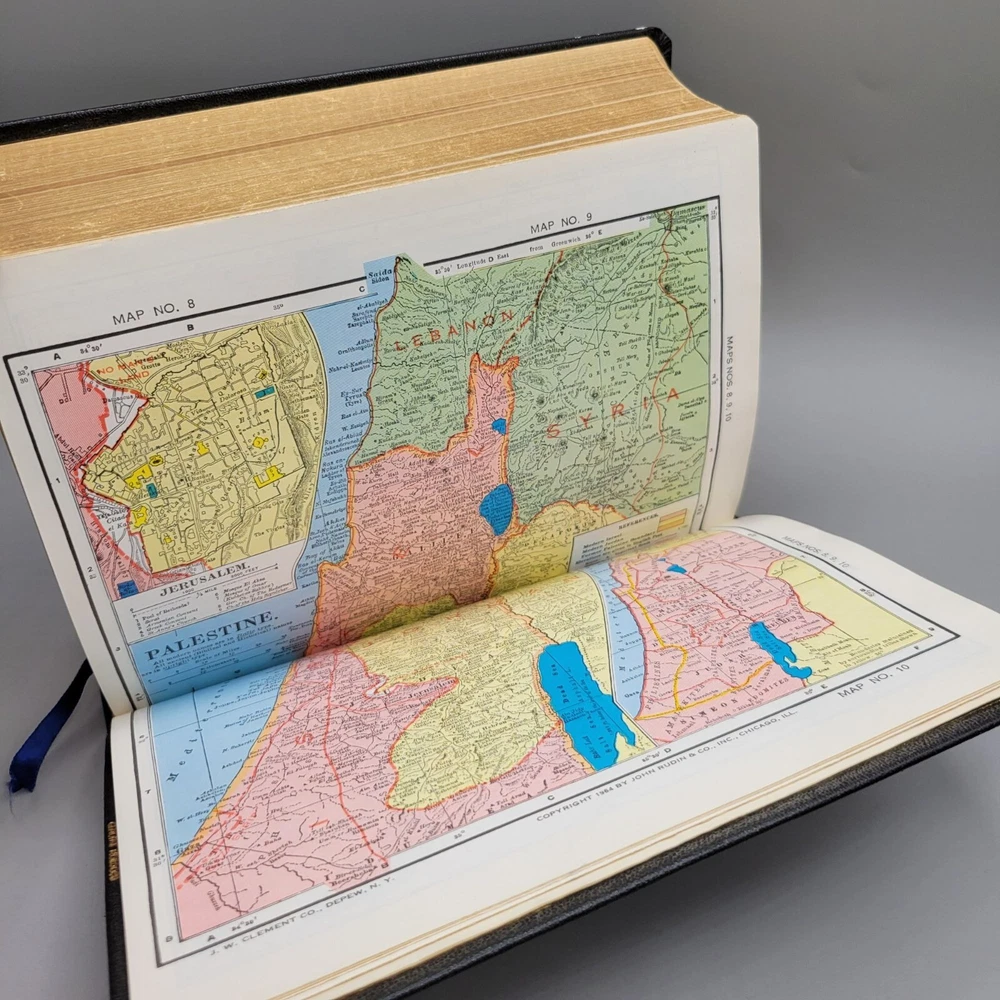 The System Bible Study Enlarged Edition based on the authorized King James Version. Published by John Rudin & Co, dated 1971. Morocco pebbled leather cover. Blue satin bookmark with black and white and color maps. Contains 786 plus pages. Condition - Nearly new condition with no damage or handwriting found. Measures - 9" x 6.5" x 2" BN032325