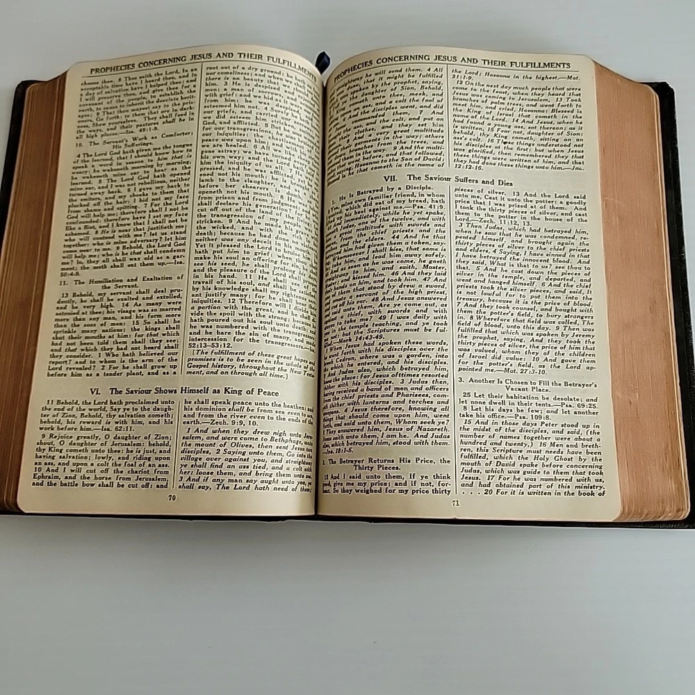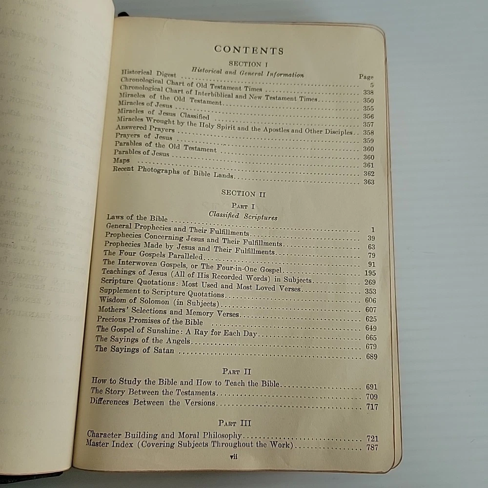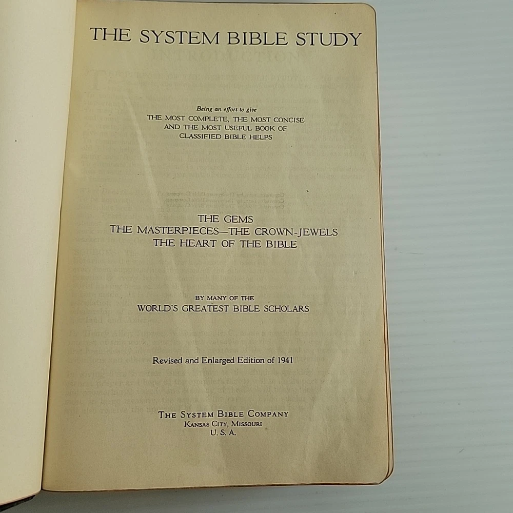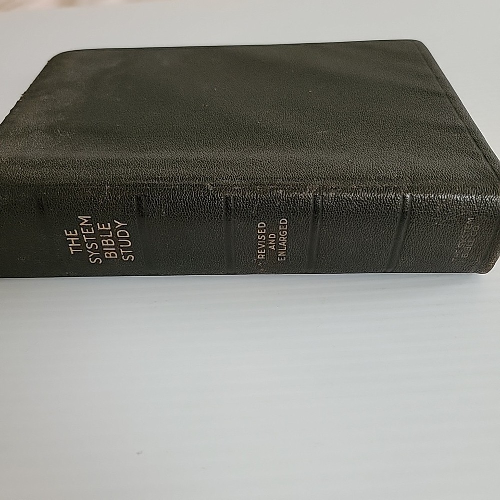 Please review photos as they serve as part of the description. The System Bible Study Revised and Enlarged Edition based on KJV Black Leather is a valuable resource for those interested in religious history. This leather-bound study guide, published by The System Bible Company in 1941, contains 786 pages of informative content. It is written in English and intended for young adults and adults. The book measures 6.25 inches in length, 9 inches in height, and 2.25 inches in width, with a weight of 3 pounds. It is a vintage edition and features a top edge gilt. The book is categorized under "Books & Magazines" and "Books" and has a genre of "Religious & Spiritual". Purchase this rare and insightful study guide today.