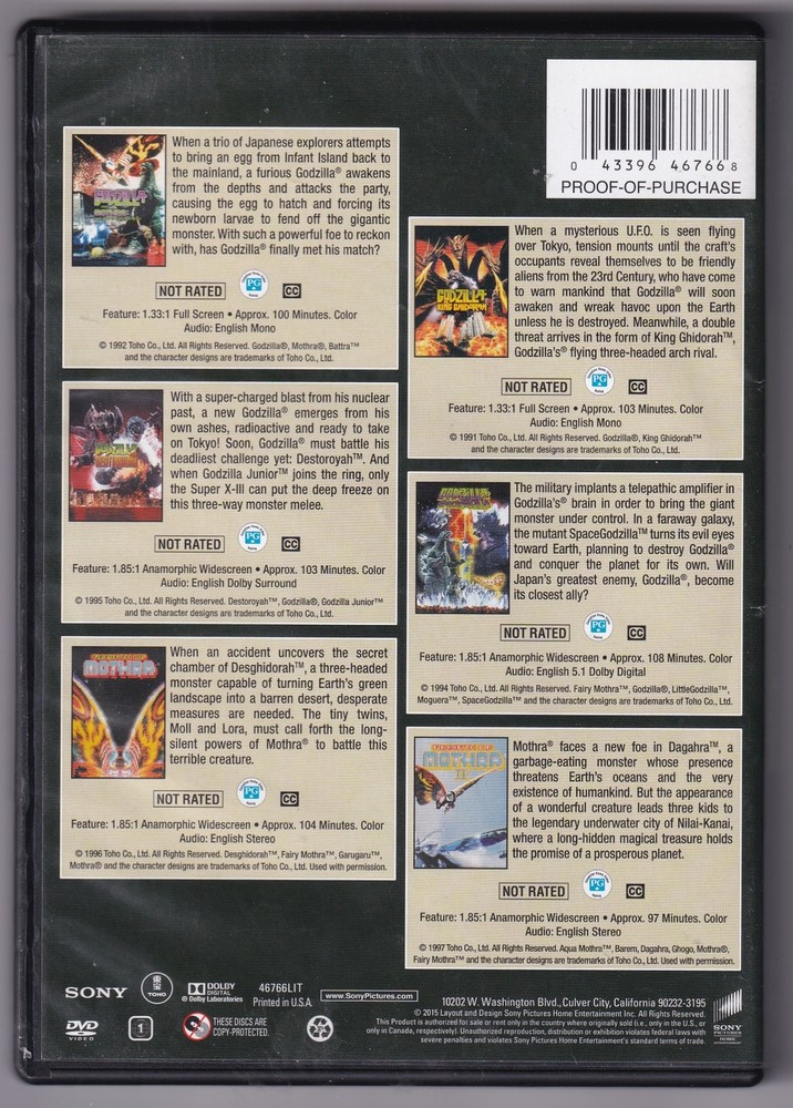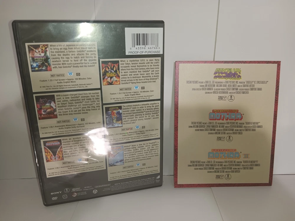 DVD Region USA and Canada 3 Disc DVD Set includes the movies: Godzilla VS King Ghidorah Godzilla and Mothra The Battle For Earth Godzilla Vs Destroyah Godzilla VS Space Godzilla Rebirth of Mothra Rebirth of Mothra II NOT A STOCK PHOTO; Item(s) pictured are the exact items being sold, nothing more and nothing less. Please review photos carefully as I take the time to get detailed images of the items being sold. Please ask any questions prior to purchase; I do not accept returns. Included: DVD case with case art, Insert and and DVDs as Shown DVD Case has minor shelf wear, Paper DVD Cover Art has wear, Insert has wear/creasing, All Discs Play Tested and in PERFECT working condition! Ships Insured, Signature Required (depending on Feedback history) (any issues in shipping YOU file an Insurance Claim) Any offers accepted will not be cancelled for any reason! Listing and template services provided by inkFrog