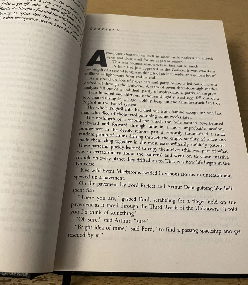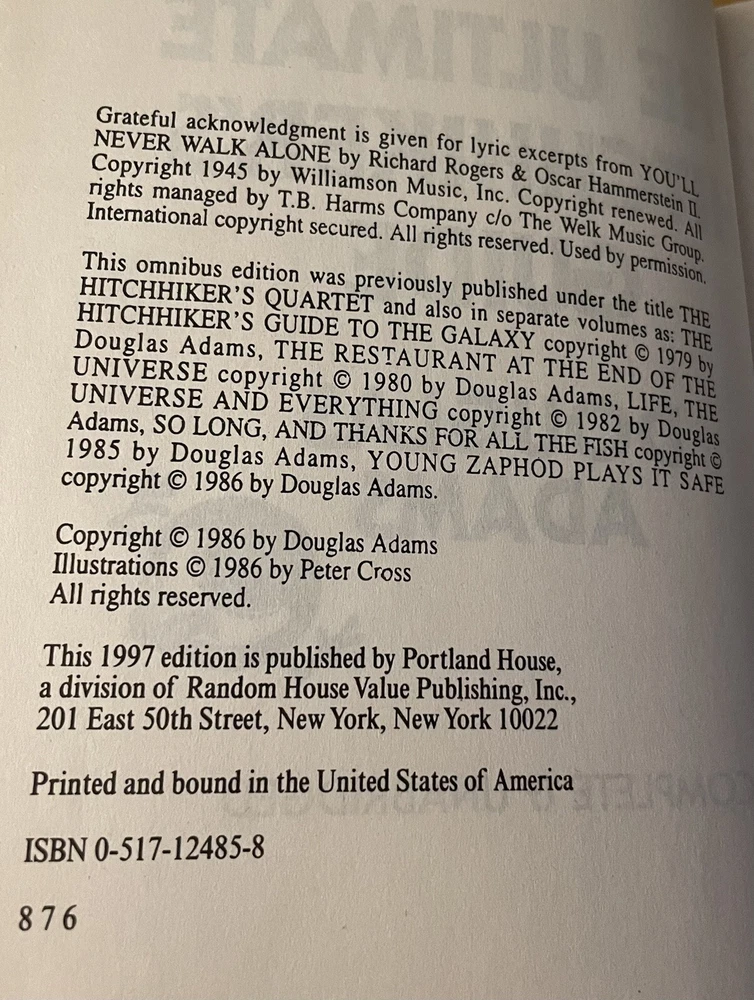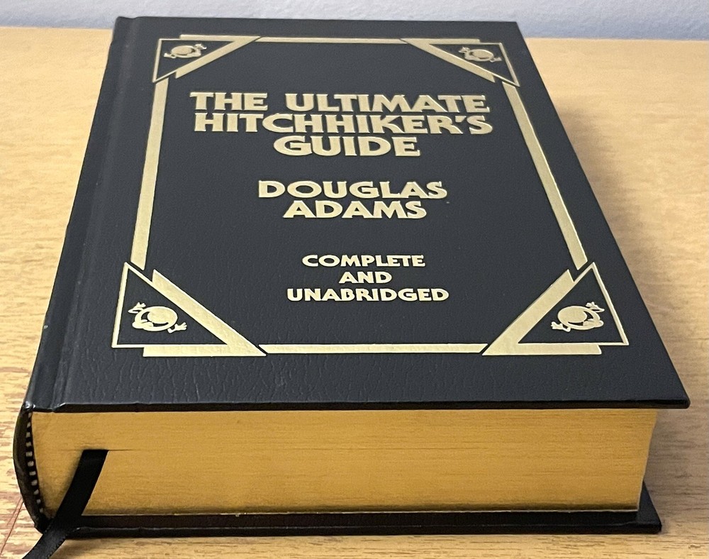 Hello! Listing is for a 1997 “The Ultimate Hitchhikers Guide Complete and Unabridged” Hardcover Book by Douglas Adams. Item is used and in very good condition, shows very little wear from use, very clean, with a few small marks. Please reach out for any questions.
