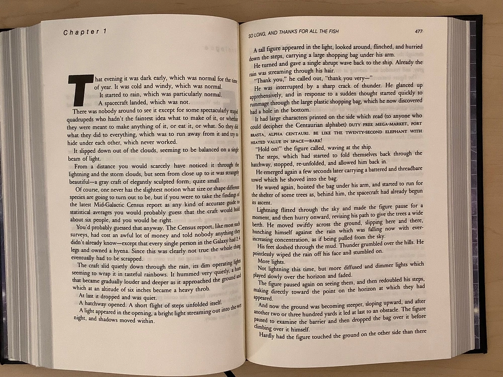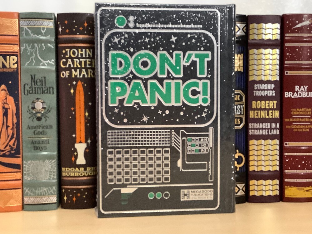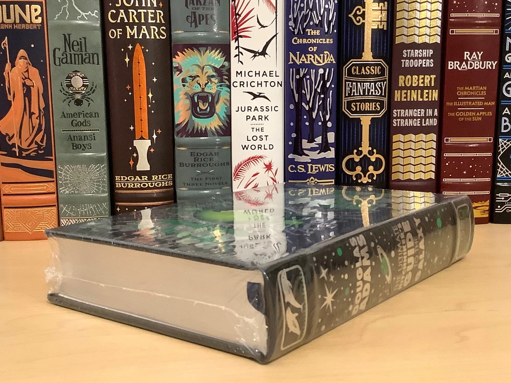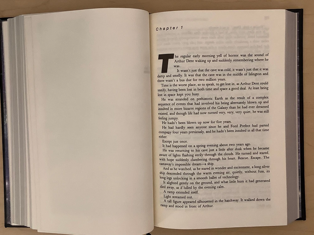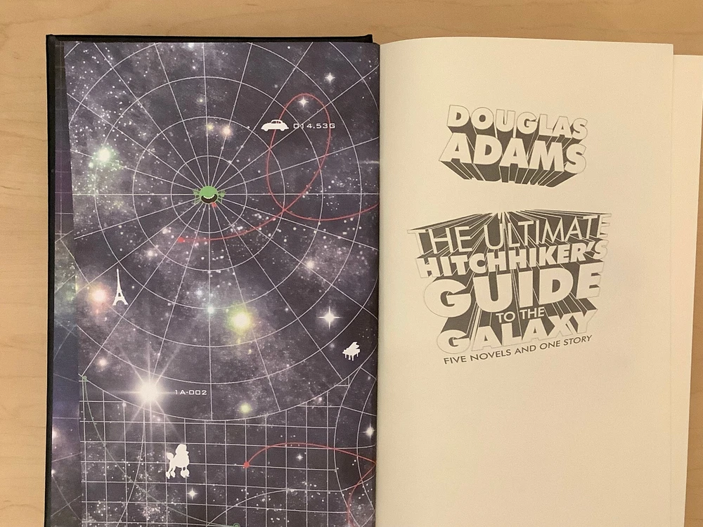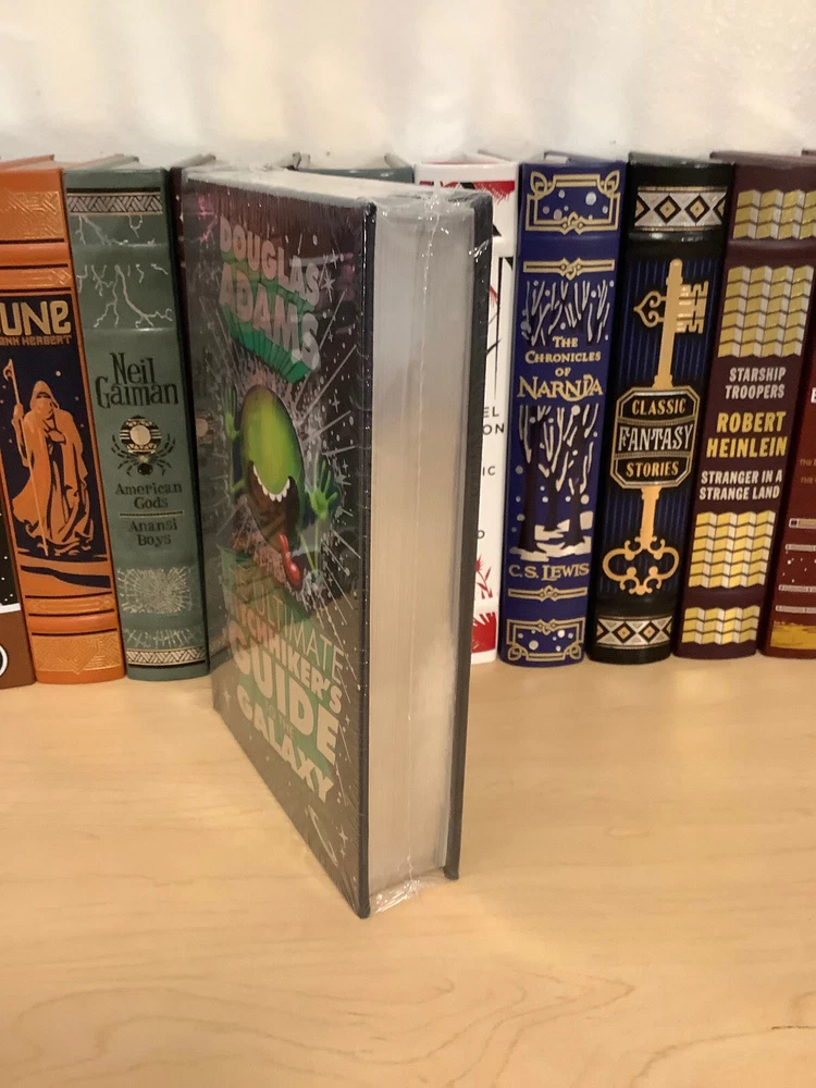 The Ultimate Hitchhiker’s Guide To The Galaxy by Douglas Adams bound in leather, with silver edged pages and a ribbon marker contents Hitchhiker’s Guide to the Galaxy The Restaurant at the End of the Universe Life, the Universe and Everything So Long, and Thanks for All the Fish Mostly Harmless and the bonus short story Young Zaphod Plays It Safe Item Condition: This is a leatherbound hardcover, sealed. The seal is beginning to open and there are some flaws /dings to the silver page edging. Dimensions are approx: 9.25" x 6.25" x 1.5" This book will ship in a box with bubble wrap. Photos 1-8 are of the actual book that will be shipped, the rest are examples of the book from an open copy.