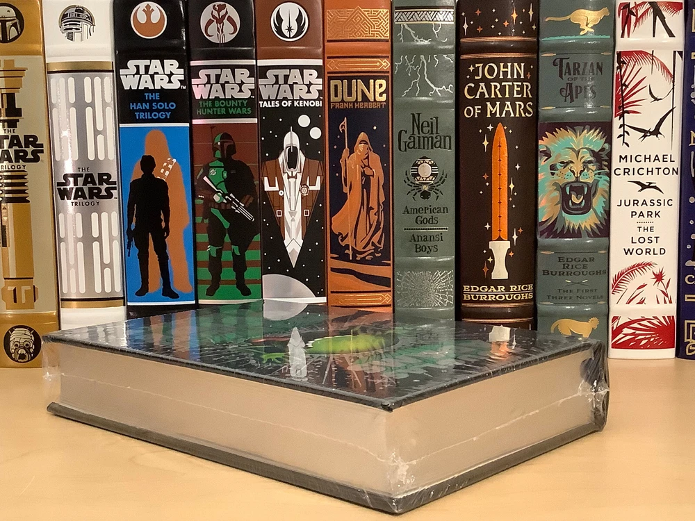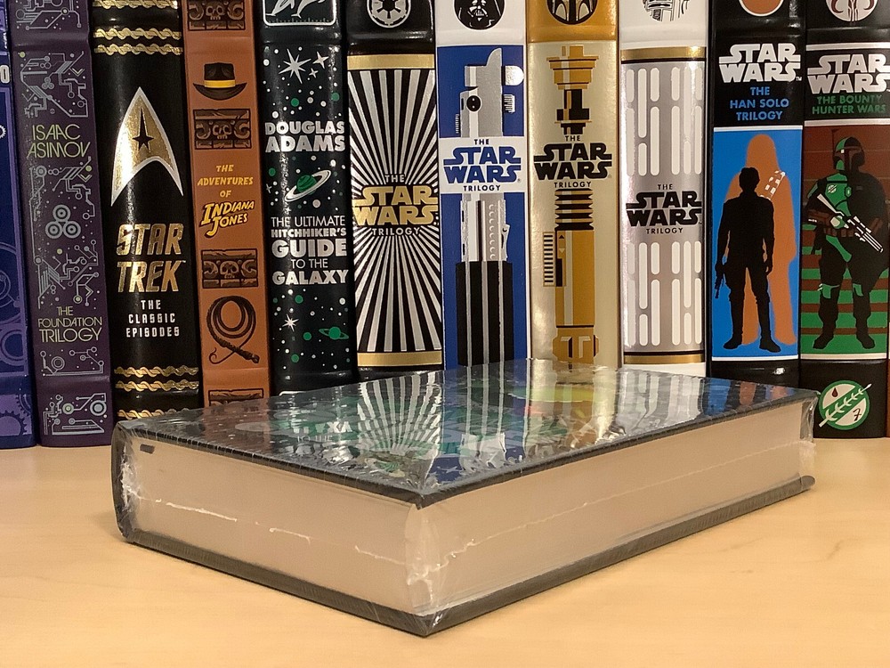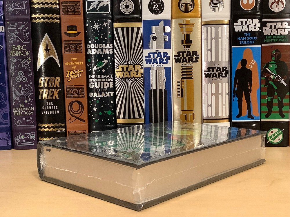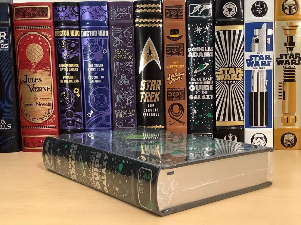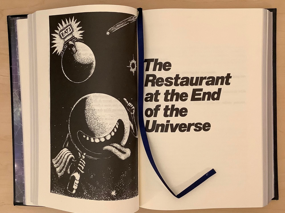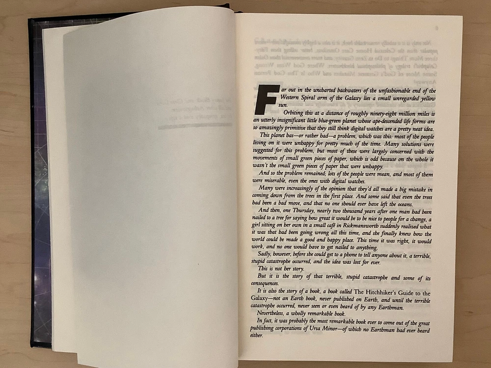 The Ultimate Hitchhiker’s Guide To The Galaxy by Douglas Adams bound in leather, with silver edged pages and a ribbon marker contents Hitchhiker’s Guide to the Galaxy The Restaurant at the End of the Universe Life, the Universe and Everything So Long, and Thanks for All the Fish Mostly Harmless and the bonus short story Young Zaphod Plays It Safe Item Condition: This is a leatherbound hardcover, sealed. The seal is beginning to open and there are some flaws /dings to the silver page edging. Dimensions are approx: 9.25" x 6.25" x 1.5" This book will ship in a box with bubble wrap. Photos 1-8 are of the actual book that will be shipped, the rest are examples of the book from an open copy.