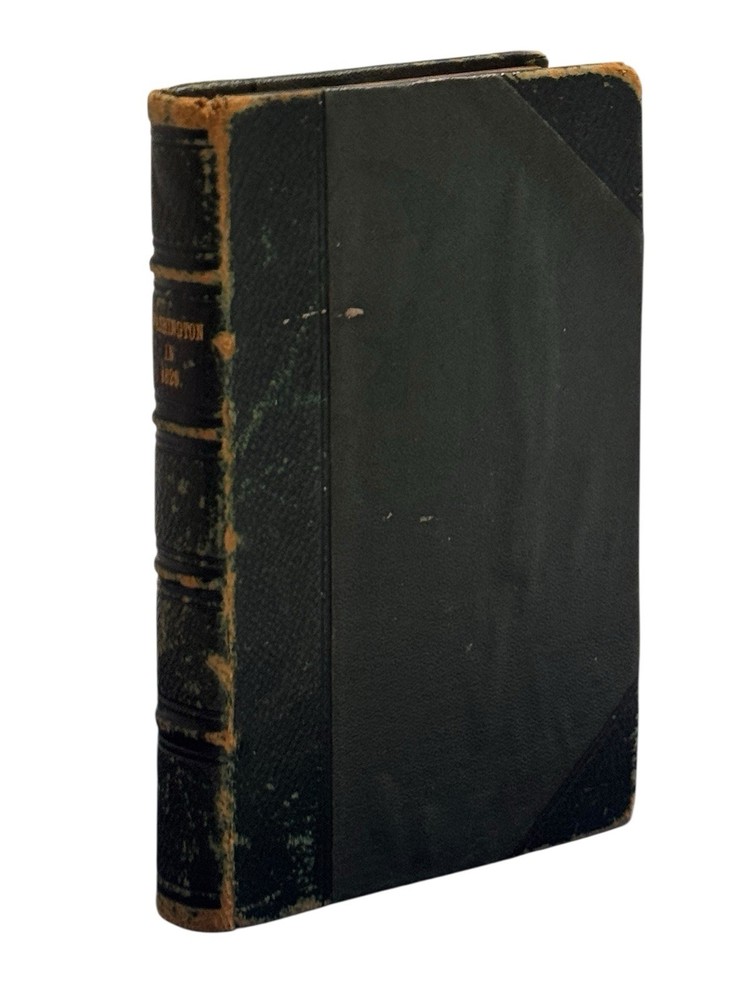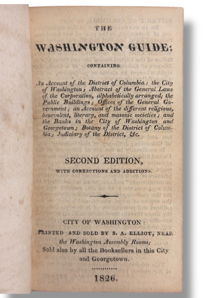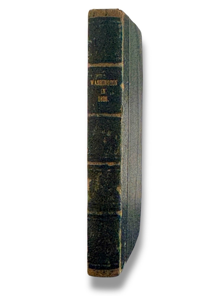 [Elliot, William]. The Washington Guide. Washington: Printed and sold by S.A. Elliot, 1826. Second edition. 32mo. viii, 138, [2], 139-150 pp. Bound in later 3/4 green Moroccan over green cloth coveted boards; gilt titling to spine, four raised bands; all edges marbled, marbled endpapers. The title is cited by the House of Represented as having no illustrations [History, Art & Archives, U.S. House of Representatives, "The Washington Guide,"], and indeed none are present in this example; the preface alludes to a map, however, though it is not expressly stated if this or other plates would have been bound in. No loose pages or disturbances to binding noted. Moderate wear, leather rubbed along front joint and spine ends, some bubbling to the cloth on front cover. Rear hinge starting with paper tear at gutter. Pages are bright and supple. Binding firm. Ex-university library with single ink stamp on blank in rear of text. No other markings, internal or external. A very good copy of this scarce early city guide for the “business traveler” or casual visitor to Washington, D.C., written shortly after the War of 1812 and first published in 1822. Landmark buildings were few, so the text goes into great detail about structures that did exist, as well as the varieties of trees and plants to be found in the city's many green spaces, and the fish that inhabited the Anacostia (or Eastern Branch) and Potomac rivers. Even detailed descriptions of the weather were included in this guidebook.