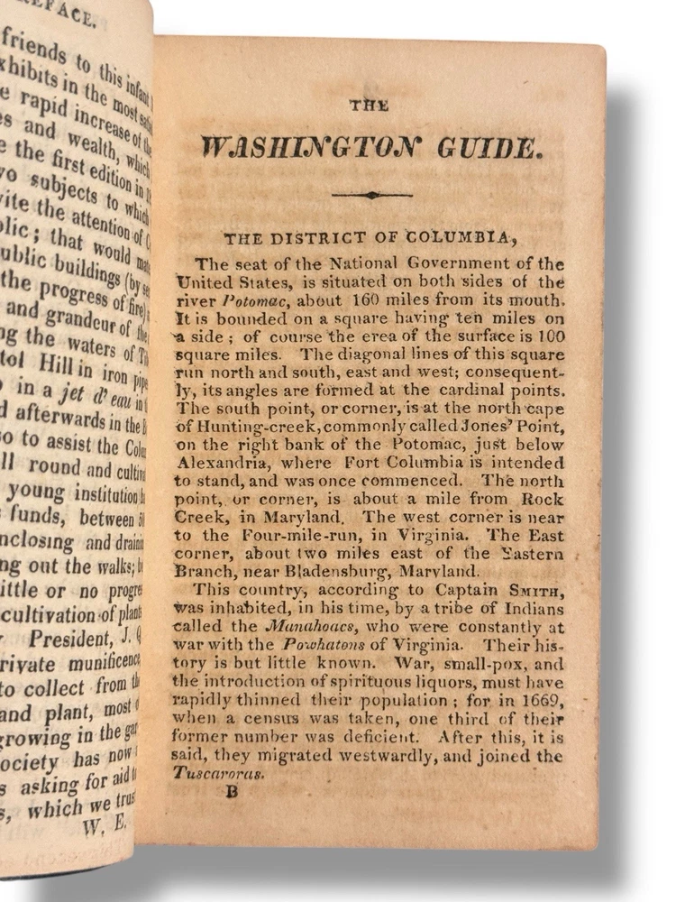 This rare 1826 edition of *The Washington Guide* is a fascinating piece of early D.C. history! The later green morocco binding is elegant, with gilt detailing and marbled edges adding charm. Though it lacks illustrations as noted, the detailed text offers a unique glimpse into the capital’s past. A must-have for collectors of historical D.C. memorabilia—its compact size and rich content make it a standout treasure.