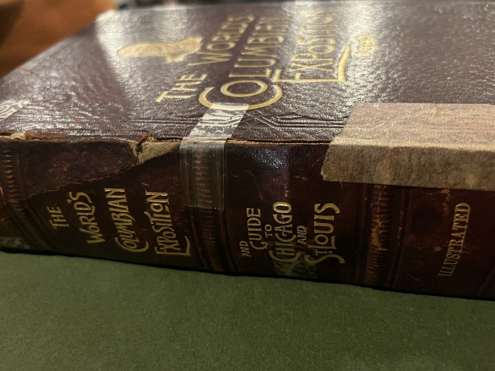 Original guide to the first World’s Fair that was held in Chicago. Extremely old book. Leather bound and in excellent condition for being estimated at 131 years old. Only imperfections are on the binding and has tape on the bind to prevent further damage from occuring. Was stored in a climate-controlled warehouse since 1989 and was stored in an indoor private library before that. This book is part of a private collection that is being liquidated due to lack of storage.