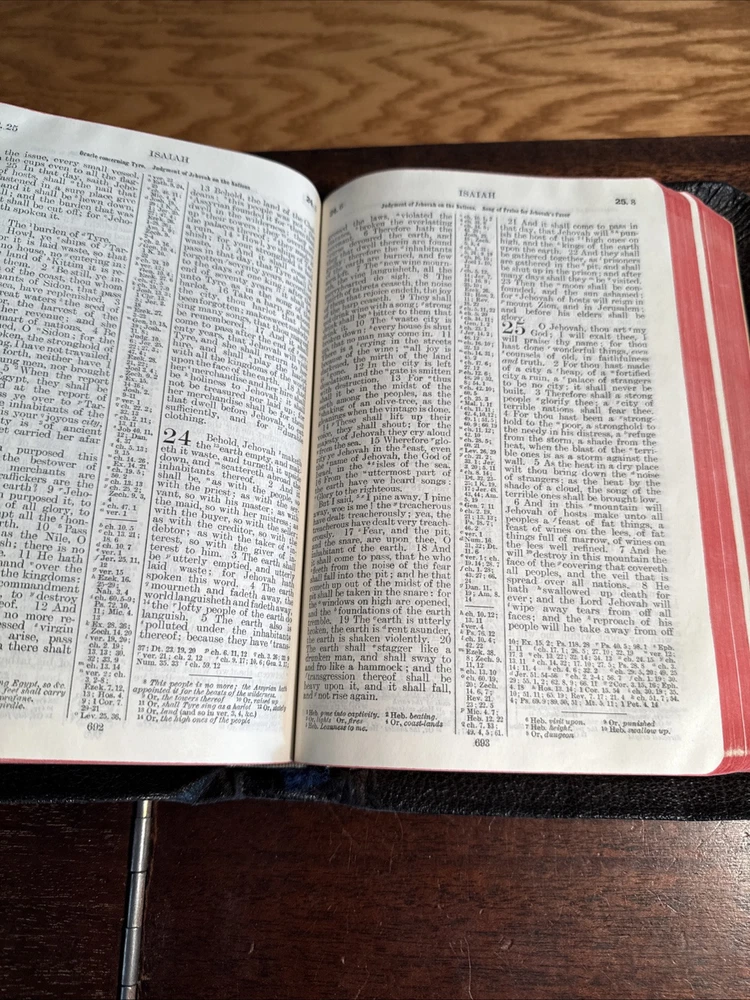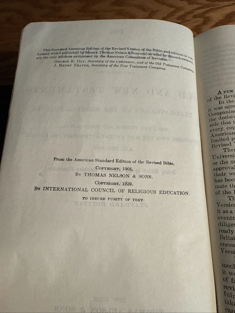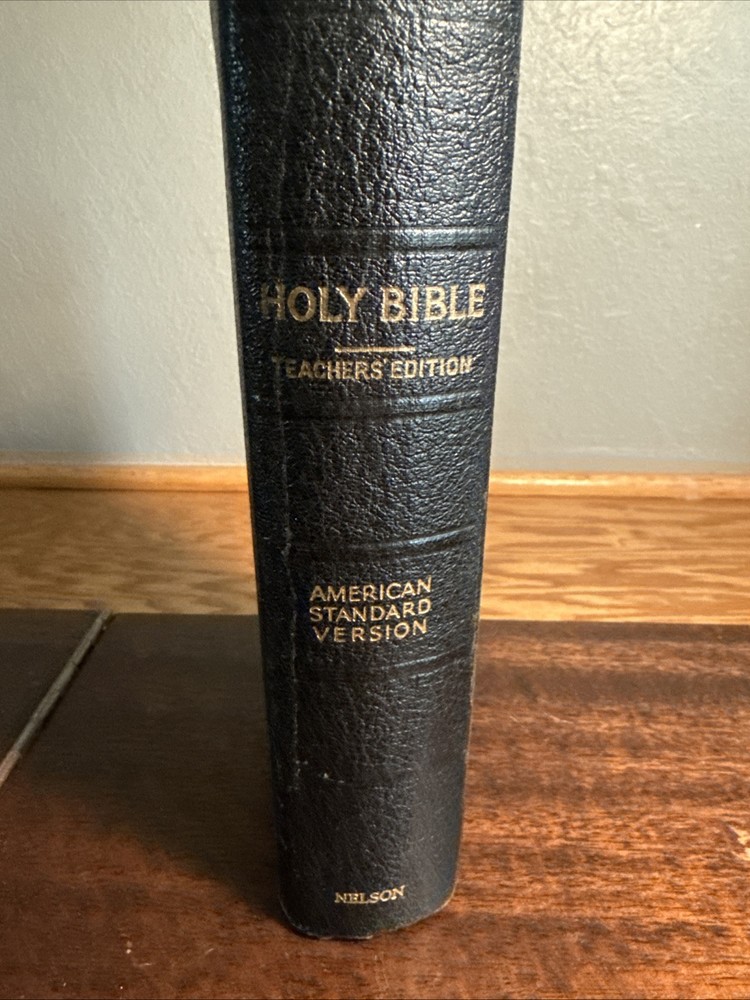This is a Thomas Nelson Holy Bible American Standard Teacher's Edition from 1901-1929. It is an illustrated leather-bound Bible in English, published in New York by Thomas Nelson. The book is focused on Christianity and contains teachings related to religion and spirituality. It is a special edition for teachers, featuring various authors and was manufactured in Morocco.