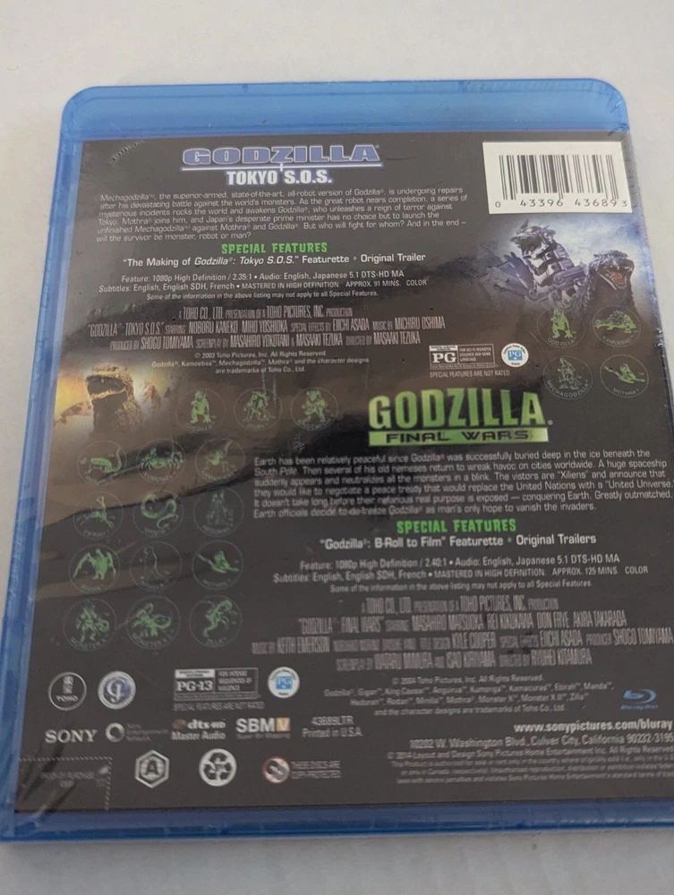 Slightly torn packaging on top as shown in photo but this has never been opened Experience the ultimate battle between Godzilla and his enemies with this remastered Blu-ray double feature. The set includes the films "Godzilla: Final Wars" and "Godzilla: Tokyo S.O.S", both rated PG-13. This never-opened set is a must-have for any movie collector. Immerse yourself in the action-packed scenes and stunning visuals of these epic battles. The double feature is presented in Blu-ray format, making it a unique addition to your collection. Don't miss out on this opportunity to own a piece of movie history.