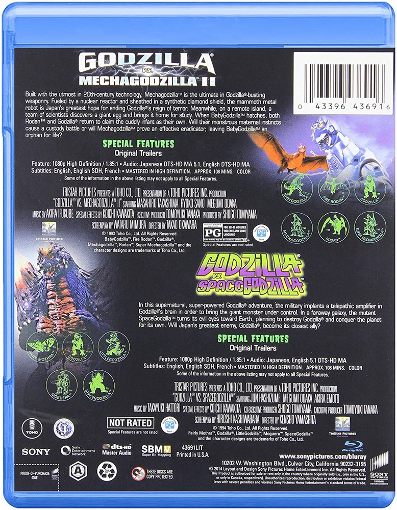 Toho Godzilla Vs. Mechagodzilla/Spacegodzilla (Blu-ray REMASTERED 2014 NEW AND SEALED BUT HAS STICKER AND SOME TEARS GREAT MOVIES FEATURES:1080p HIGH DEFINATION / 1.85;1 AUDIO;JAPANESE,ENGLISH 5.1 DTS-HD MA SUBTITLES;ENGLISH,ENGLISH SDH,FRENCH MASTERED IN HIGH DEFINATION APPROX 108 MIN ENJOY ADDING TO YOUR COLLECTION
