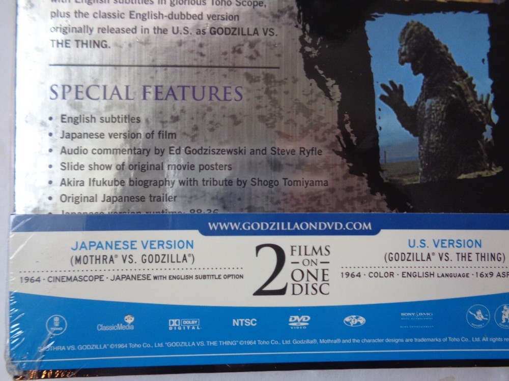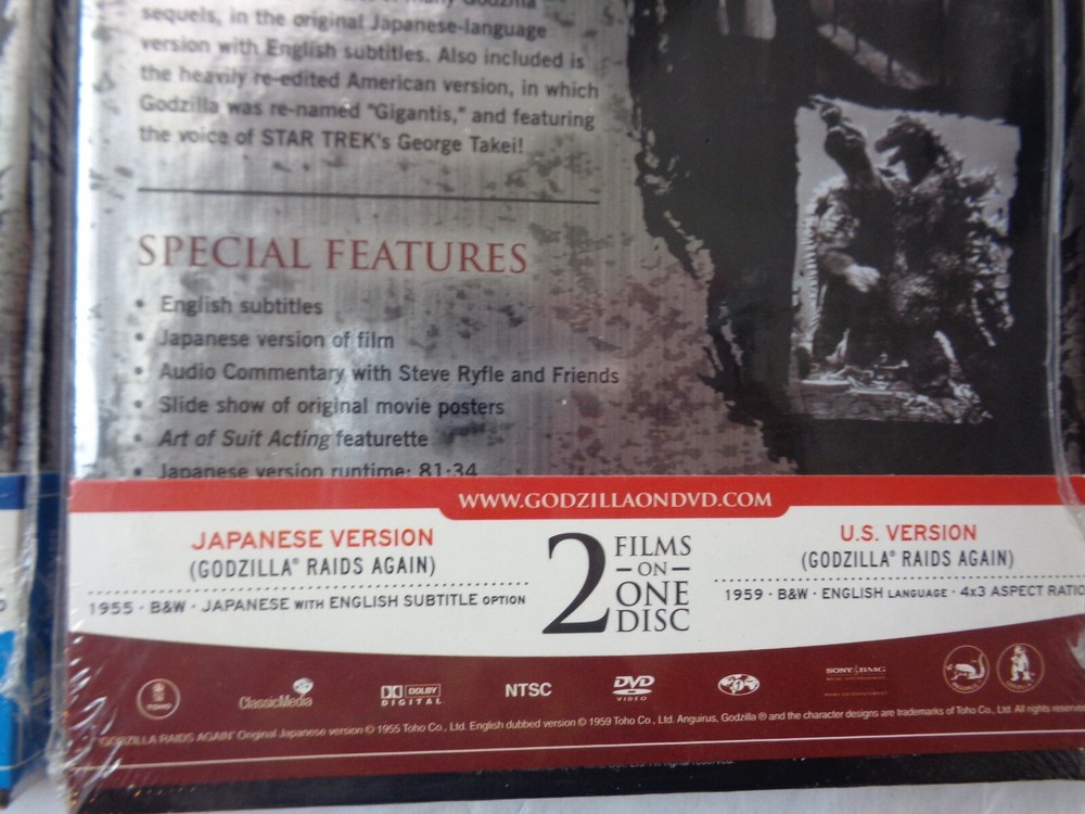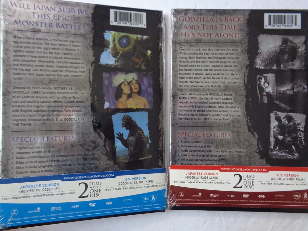 Godzilla DVDs DESCRIPTION: This listing is for 2 separate DVDs. They are titled "Mothra vs. Godzilla" and "Godzilla Raids Again" and both contain the Japanese and US versions on one disc each. They are labelled as the "Toho Master Collection", are Region 1 and are NTSC format. Photo(s) are of the actual item(s) you will receive. PAYMENT: I will usually ship within 1 business day of payment being received. Payment is due within 3 days of purchase on auctions. Please leave feedback, I always do! SHIPPING: Postage is FREE for USPS Media Mail with tracking. Expedited Shipping is available.