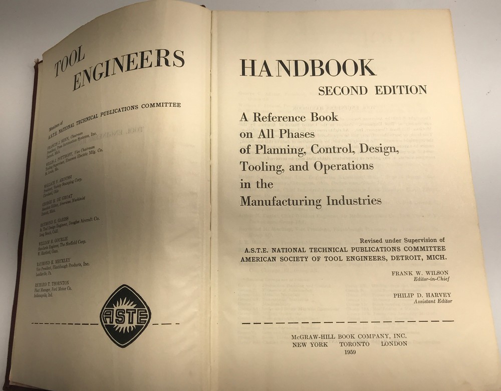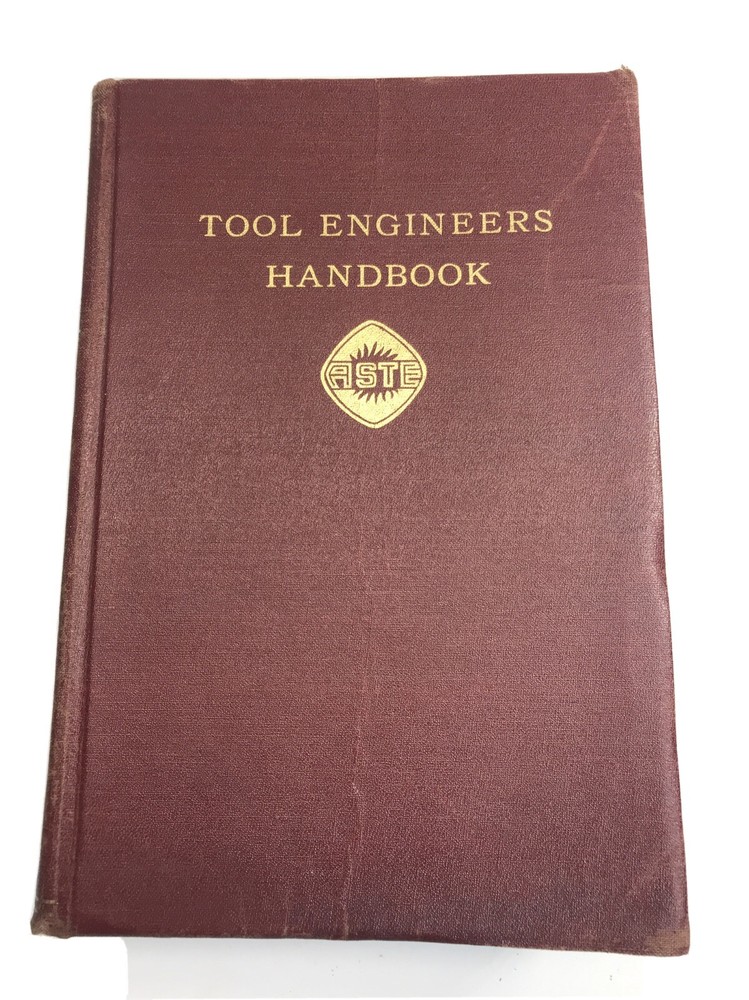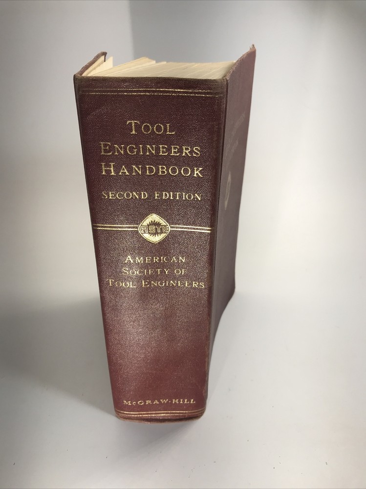 Tool Engineers Handbook Vintage 1959 2nd Edition McGraw Hill ASTE (American Society of Tooling Engineers) McGraw-Hill A reference book on all phases of planning, control, design, tooling, and operations in the manufacturing industries Frank W. Wilson & Philip D. Harvey Editors and several pages of contributors are listed Vintage (1959) ASTE Tool Engineers Handbook Good condition, previous owners name inside and on side of book and a small edge splash on the side of the book. Perhaps it was coffee or tea. some thumbing to the lower left corner of the cover See photos Otherwise Good - Very Good condition Clean, no other markings Softbound leatherette