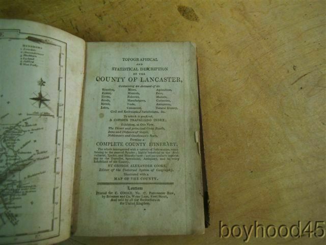 Topographical and Statistical Description of the County of Lancaster-Cooke-1800 Description Topographical and Statistical Description of the County of Lancaster-Cooke-1800 This is a wonderful find!! It is "Topographical and Statistical Description of the County of Lancaster. Containing an Account of Its Situation, Extent, Towns, Roads, Rivers, Minerals, Fisheries, Manufactures, Commerce, Fairs, Agriculture, Markets, Curiosities, Antiquities, Natural History, Civil and Ecclesiastical Jurisdictions, etc. To Which is Prefixed a Copious Travelling Guide...." Prepared by George Alexander Cooke. Printed for C. Cooke, London, undated, circa 1800. Bound in full leather. Condition is About Good-front gutter cracked and cover is completely loose. Wear to corners, clean and text block quite tight. THE ORIGINAL MAP IS PRESENT. Measures 3 3/4 X 5 1/2, 324 pages. This is a VERY SCARCE book--I HAVE LOCATED ONLY ONE OTHER COPY IN ALL OF MY INTERNET SEARCHES AND IT IS BEING OFFERED FOR $830!!!!!! I will offer this nice complete, intact copy for only $410.00 plus $3.50 S&H in the US. Canadian shipping charges will be considerably less than the general international rates quoted. Thanks for shopping mellowpagesrarebooks.com Payment I accept the following forms of payment: PayPal Shipping & Handling I will ship Priority for an additional fee upon request. PLEASE NOTE: SHIPPING COSTS FOR MULTI-VOLUME SETS OR OVERSIZED BOOKS WILL EXCEED THE STANDARD "US SHIPPING" ECONOMY RATE OF $5.00. COST OF SHIPPING OVERSIZED BOOKS OR MULTI-VOLUME SETS ARE SPECIFIED WITHIN THE TEXT OF THE LISTING. Canadian buyers are not subject to stated international shipping costs and will pay less than the amount stated. US Shipping $3.50 USPS Media Mail® International Shipping $18.00 USPS First-Class Mail International FREE scheduling, supersized images and templates. Get Vendio Sales Manager. FREE scheduling, supersized images and templates. Get Vendio Sales Manager. Payment Payment Options: Paypal Shipping Shipping Options: Domestic shipping: Fixed Shipping Charges. International shipping: Fixed Shipping Charges. Shipping Carrier Domestic International Shipping Locations Usps Book Rate $3.50 - - Usps First-Class Intl - $18.00 Worldwide I will ship to: United States, Worldwide Vendio provides powerful selling automation for sellers of all sizes. Get business information that counts! - Vendio Counters are active content free.