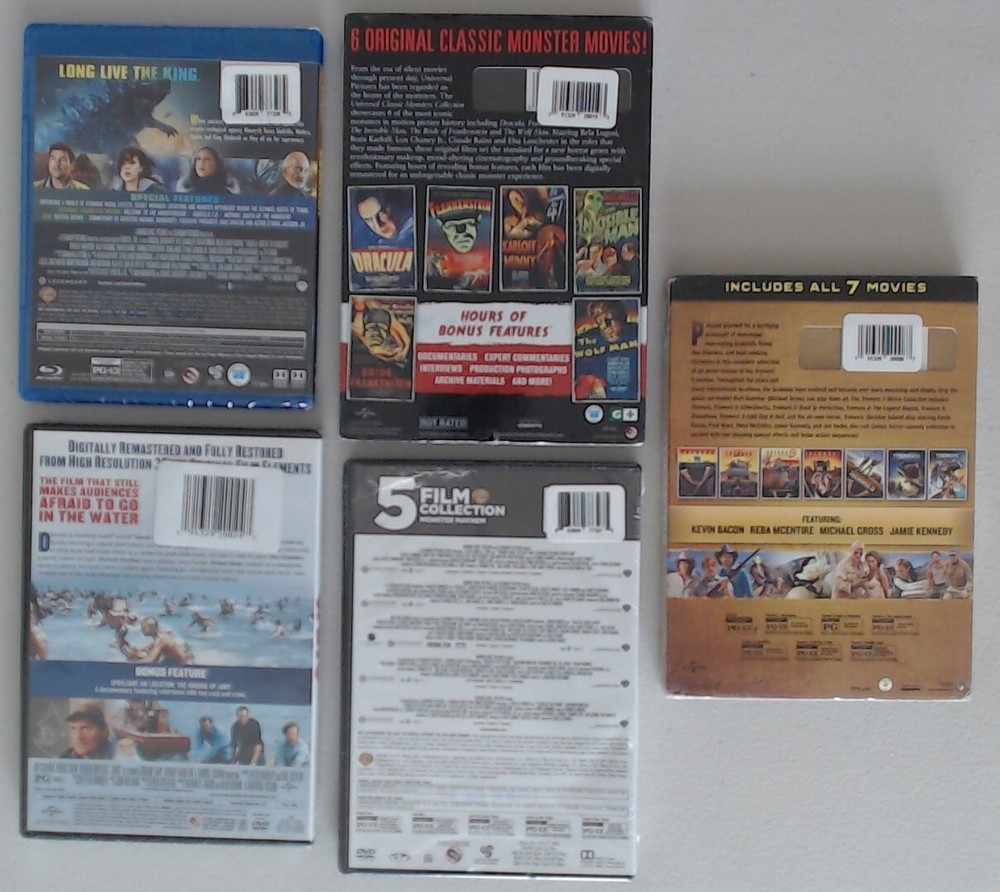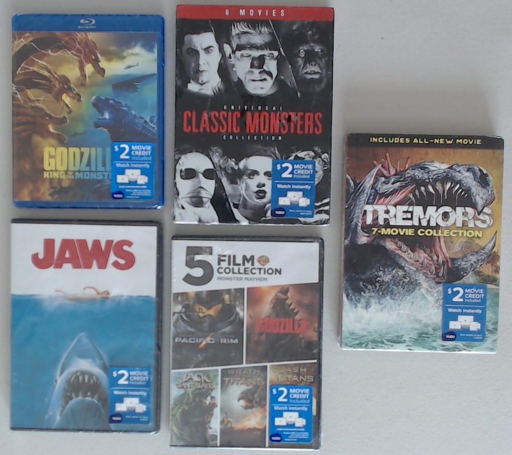 Godzilla King of the Monsters (Blue-Ray) Tremors Including: Tremors, Tremors 2 Aftershocks, Tremors 3 Back to Perfection, Tremors 4 The Legend Begins, Tremors 5 Bloodlines, Tremors A Cold Day in Hell, Tremors Shrieker Island (DVD) 5 Film Collection Monster Mayhem - Pacific Rim, Godzilla, Jack the Giant Slayer, Wrath of the Titans, Clash of the Titans (DVD) Jaws Universal Collection Classic Monsters Including: Dracula, Frankenstein, The Mummy, The Invisible Man, The Bride of Frankenstein and the Wolf Man 4