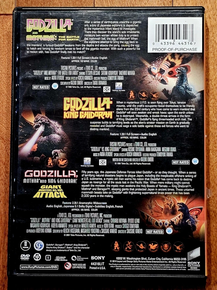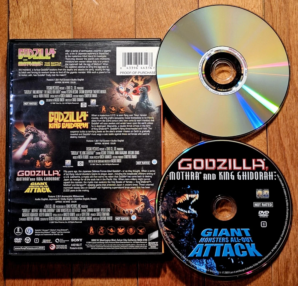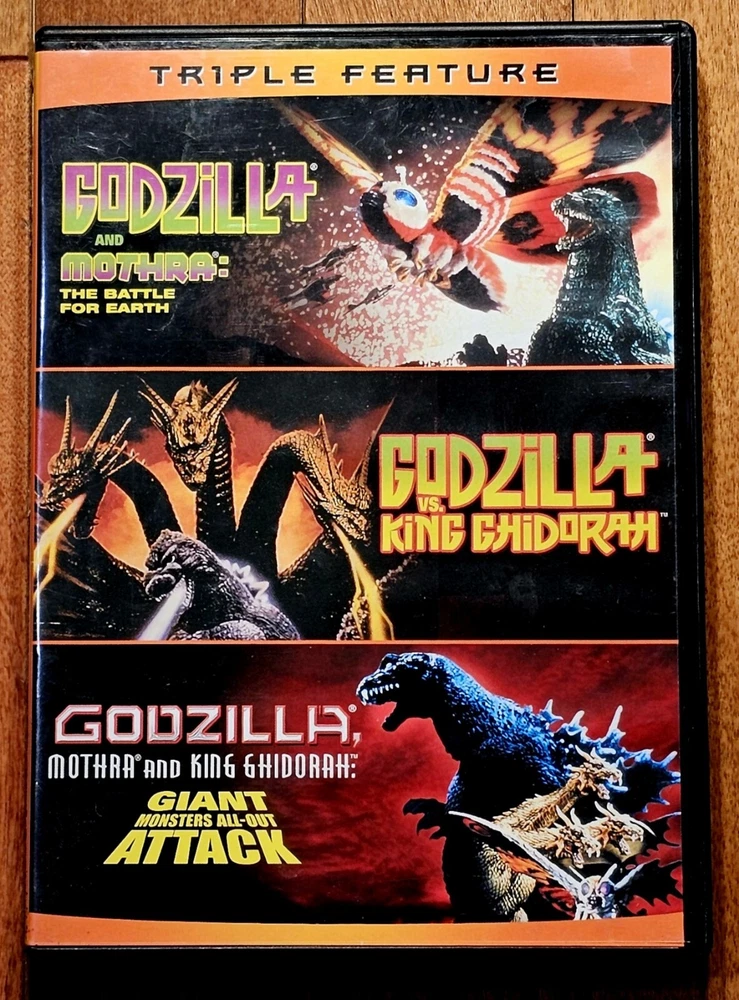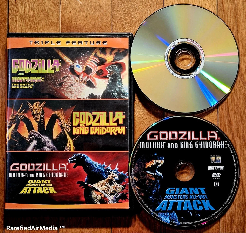 This Triple Feature Lot includes the classic sci-fi and fantasy movies Godzilla Vs King Ghidorah, Mothra, and Giant Monster Attack. The DVD format is compatible with Region Code 1 (US, Canada...) and features a deluxe edition, unrated edition, collector's edition, and box set. The music artist is Godzilla and the release year is 1992. *RARE* OOP FREE SHIPPING DVD includes original cover artwork & insert Discs no visible wear Very Good condition