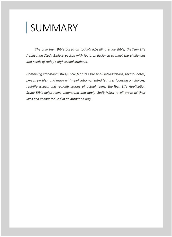 | Synopsis | The only teen Bible based on today's #1-selling study Bible, the Teen Life Application Study Bible is packed with features designed to meet the challenges and needs of today's high school students.Combining traditional study-Bible features like book introductions, textual notes, person profiles, and maps with application-oriented features focusing on choices, real-life issues, and real-life stories of actual teens, the Teen Life Application Study Bible helps teens understand and apply God's Word to all areas of their lives and encounter God in an authentic way. |