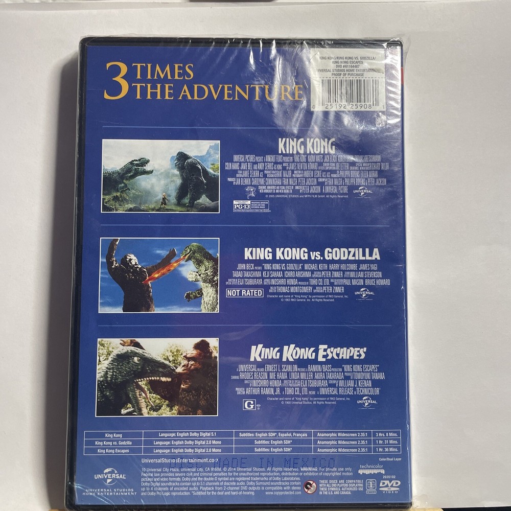 Experience the thrill of the classic movies with this Universal King Kong box set, featuring three films - King Kong vs. Godzilla, King Kong Escapes, and King Kong vs. Godzilla. Directed by Peter Jackson, this action-packed set includes films rated PG-13 and features actors such as Andy Serkis, Jack Black, and Adrien Brody. This DVD set is perfect for fans of the sci-fi and fantasy genre, with a mix of adventure, horror, drama, and mystery. The box set includes English, French, and Spanish subtitles, and is formatted for DVD Region Code 1 (US, Canada...). Get ready for a wild ride with this former rental, captioned and widescreen features.
